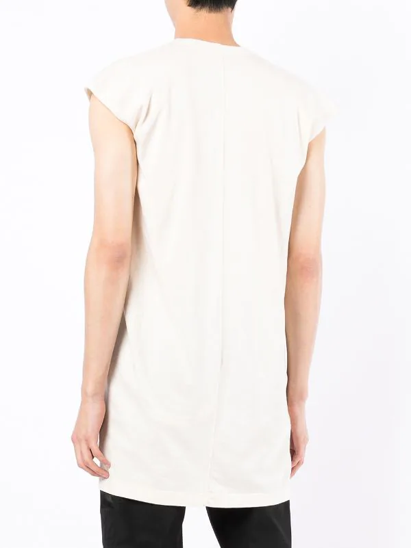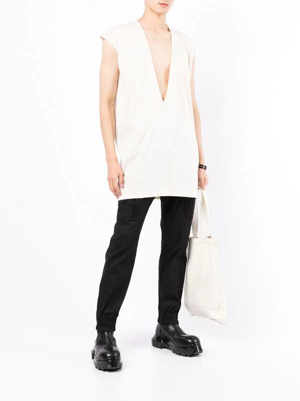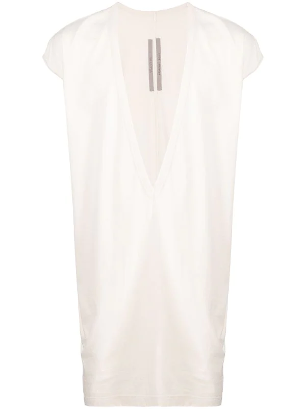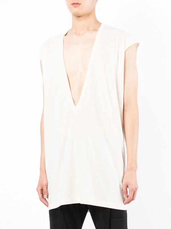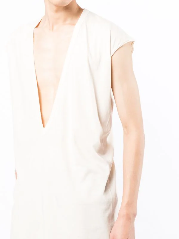 Col v profond, design sans manches, ourlet droit, détails de coutures apparentes. Couleur : blanc. Matière : coton.