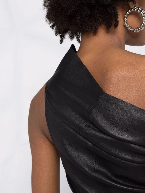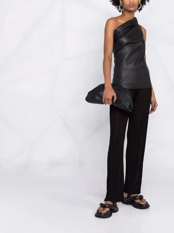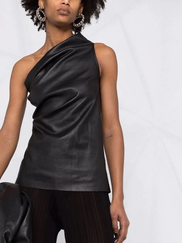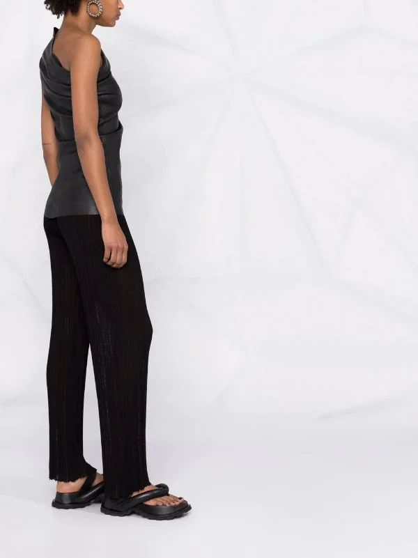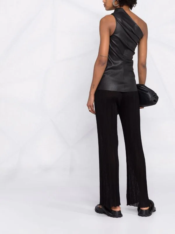 Design asymétrique à une épaule, détails de fronces, ourlet droit. Couleur : noir.