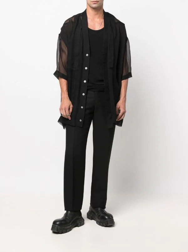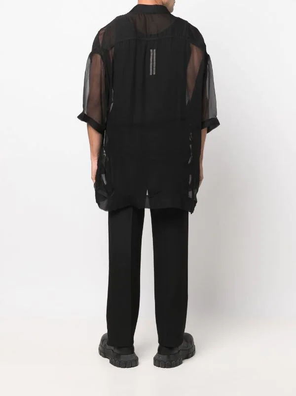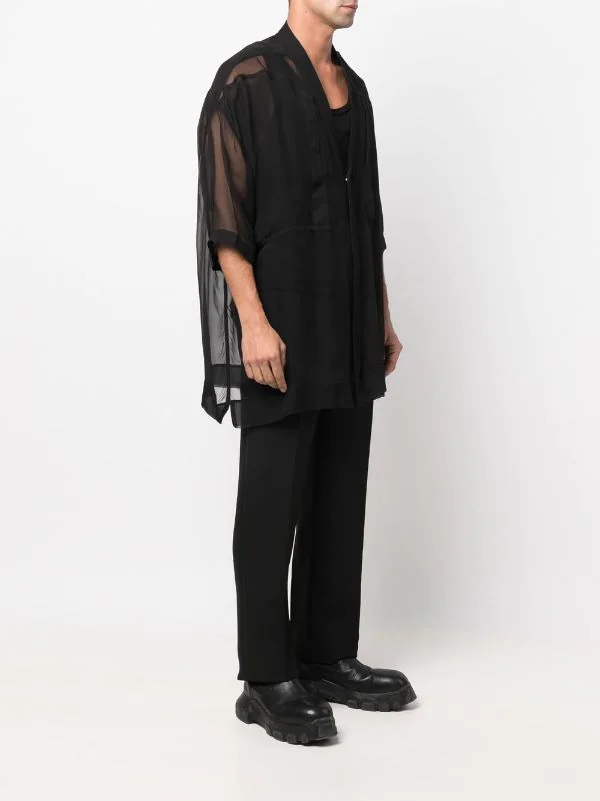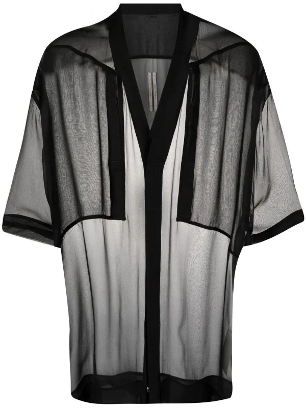Couvrance transparente, détails de coutures apparentes, détails rayés, col v, fermeture dissimulée sur le devant, manches courtes, ourlet droit. Couleur : noir. Matière : soie.