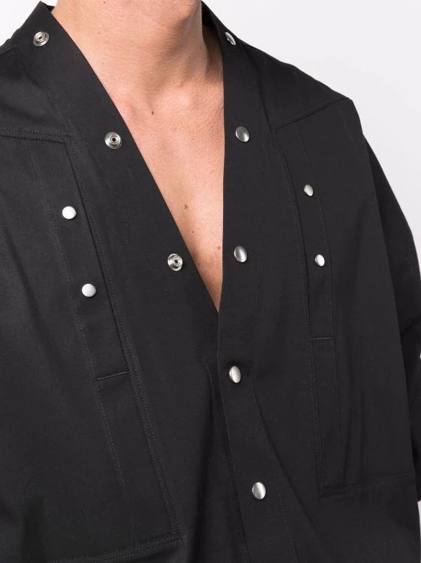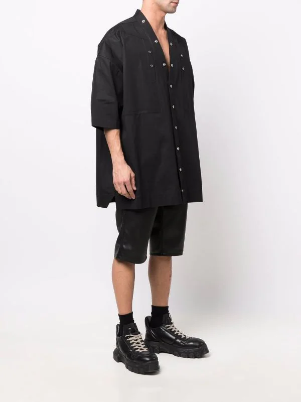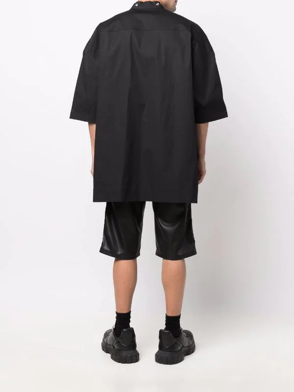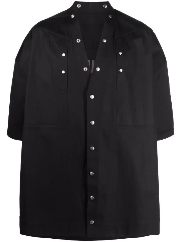 Tissage popeline, détails de coutures apparentes, col v, deux poches poitrine plaquées, fermeture à boutons pression sur le devant, épaules tombantes, manches courtes, ourlet droit. Couleur : noir.