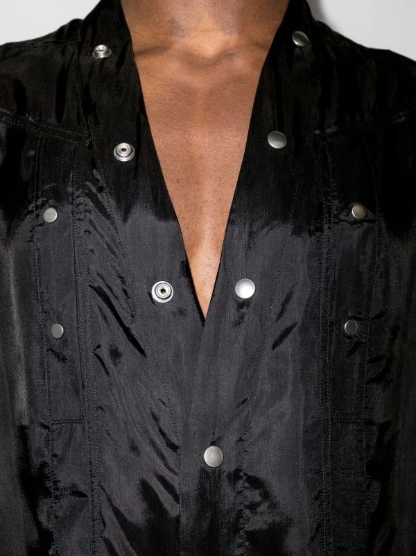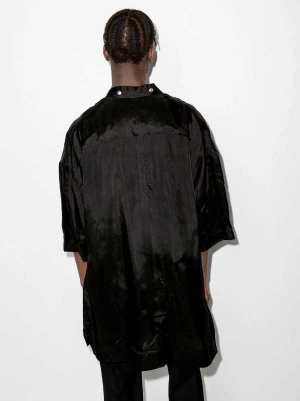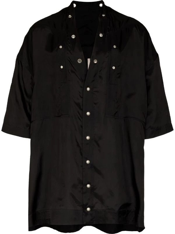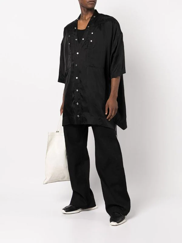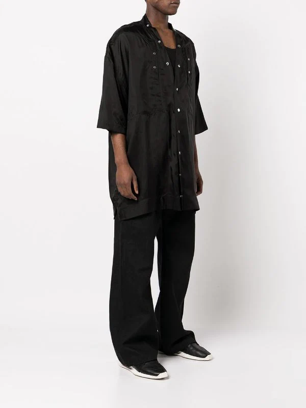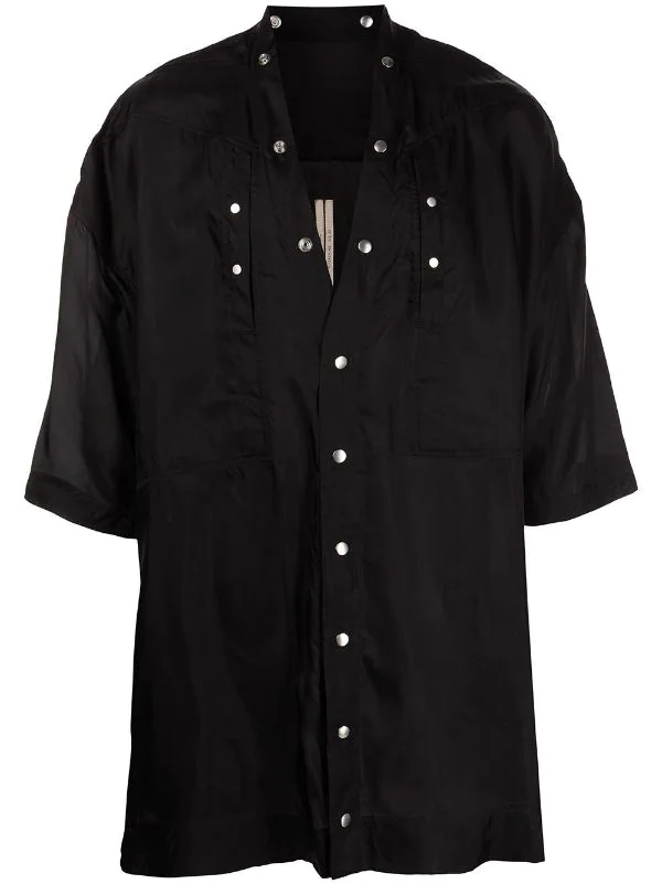 Boutonnière sur le devant, col v, manches courtes, ourlet droit. Couleur : noir.