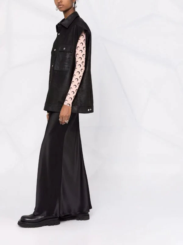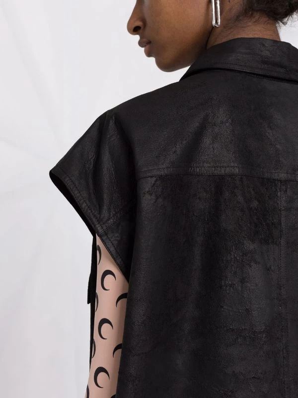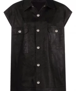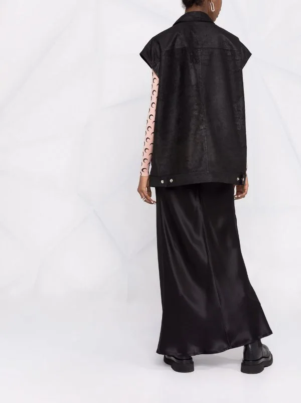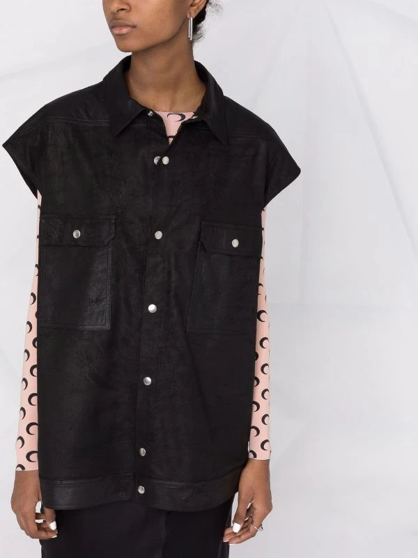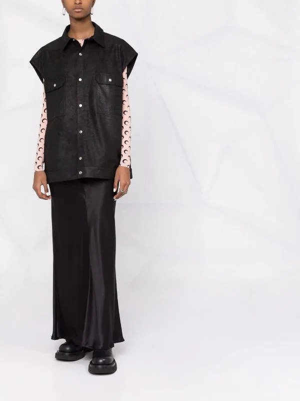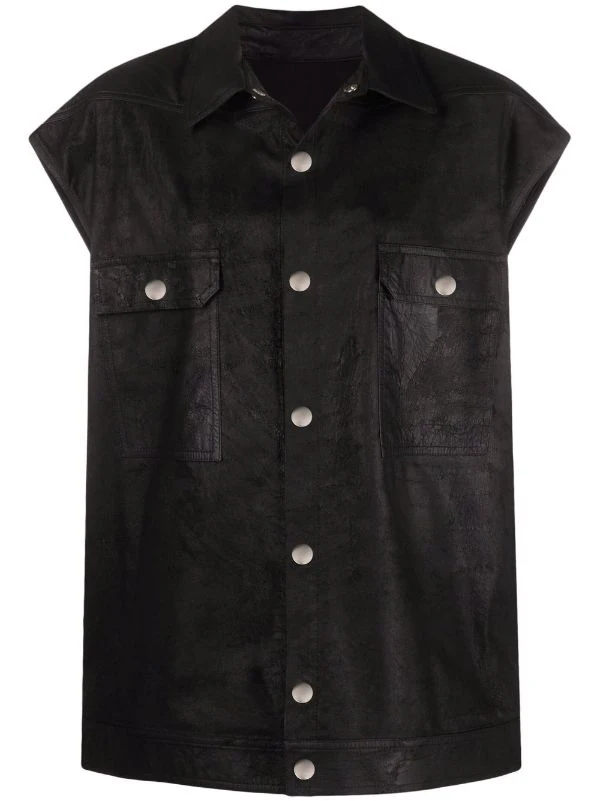 Col classique, fermeture à boutons pression sur le devant, mancherons, deux poches poitrine à rabat. Couleur : noir. Matière : peau d’agneau.
