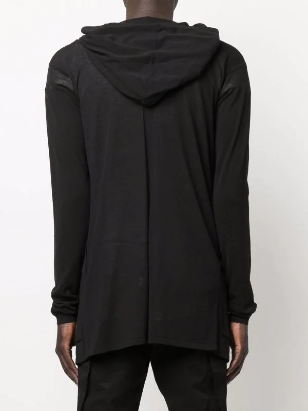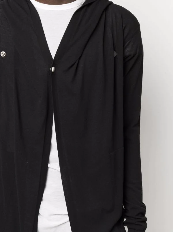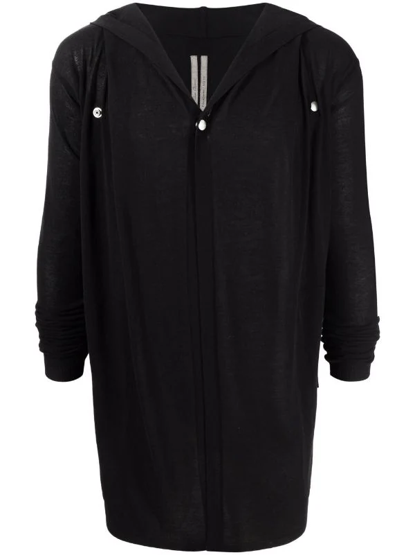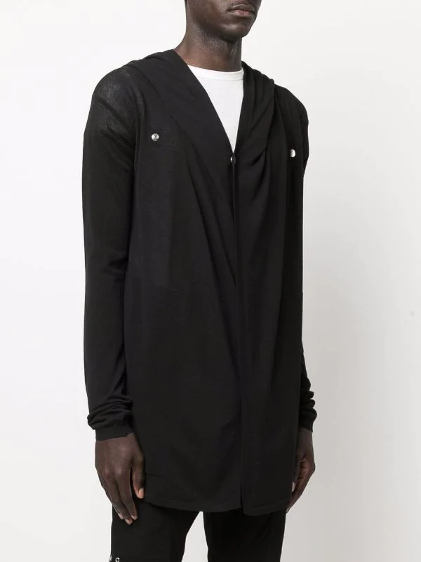 Structure légère, col v, capuche classique, manches longues, fermeture à boutons pression sur le devant. Couleur : noir. Matière : coton biologique.