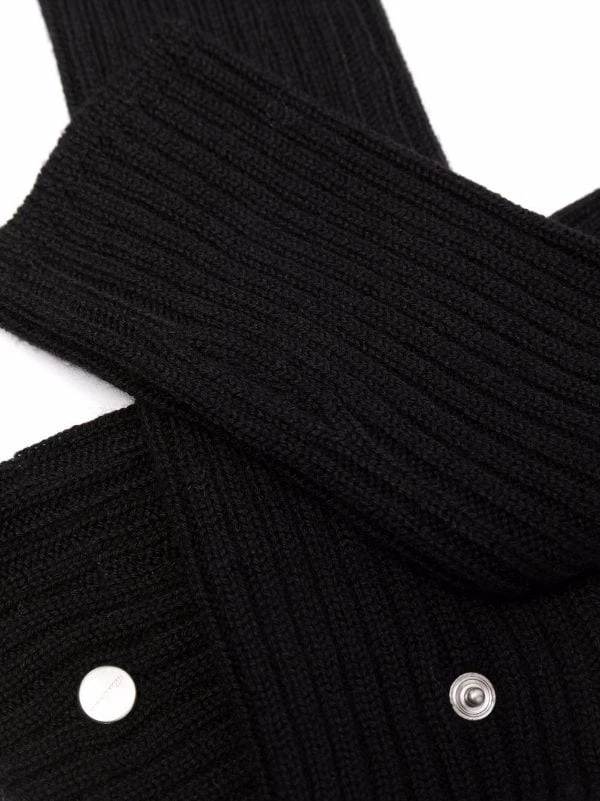 Maille nervurée, design mitaine, passe-pouce, coupe longue, fermoir à presser. Couleur : noir. Matière : laine vierge.