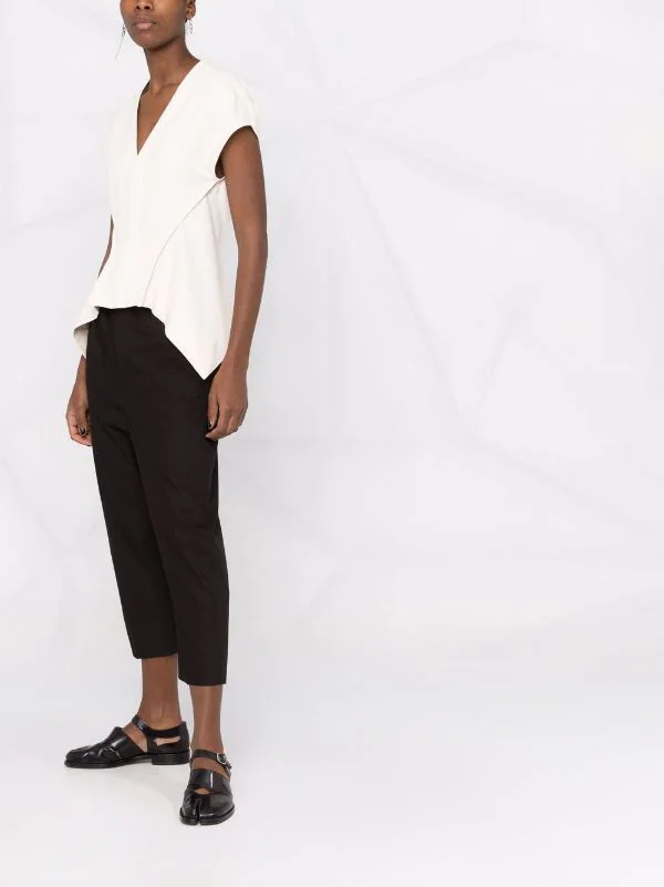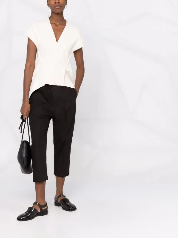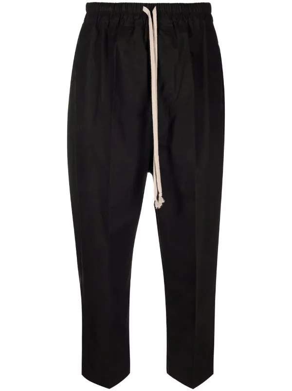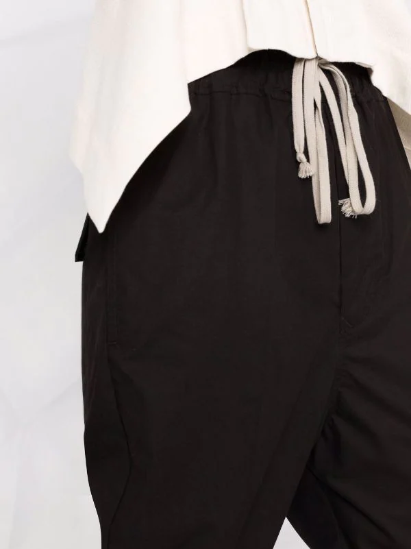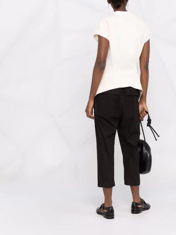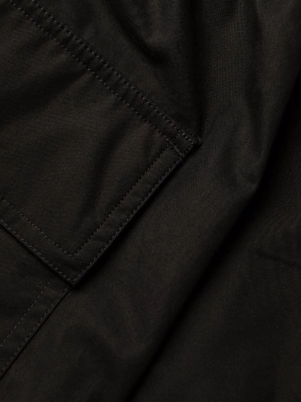 Taille élastique à lien de resserrage, poches latérales fendues, poches arrière à rabat, forme baril, coupe courte. Couleur : noir. Matière : coton.