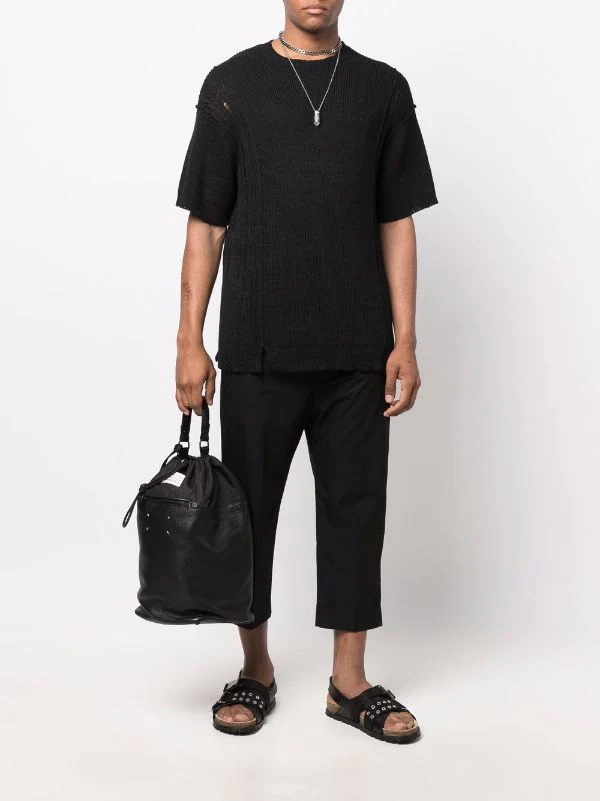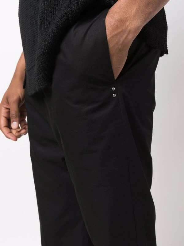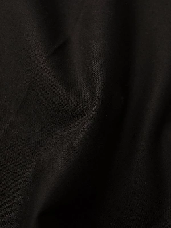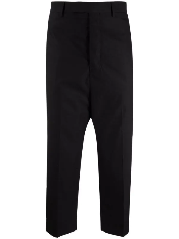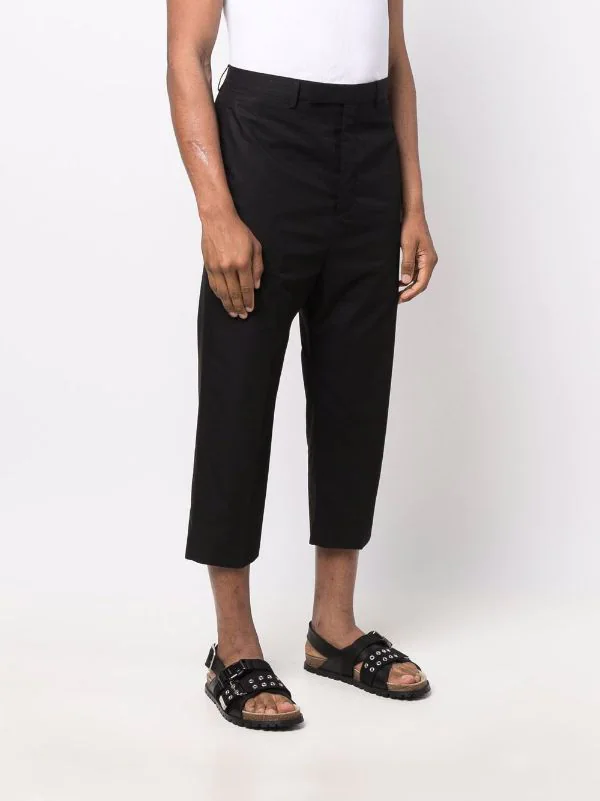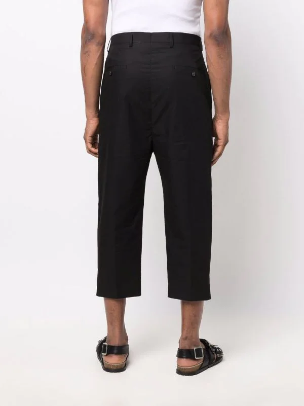 Taille mi-haute, fermeture dissimulée sur le devant, passants de ceinture, longueur crop, plis marqués, ourlet droit. Couleur : noir. Matière : coton.