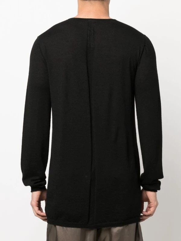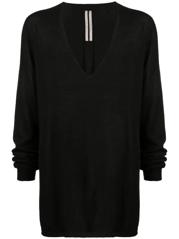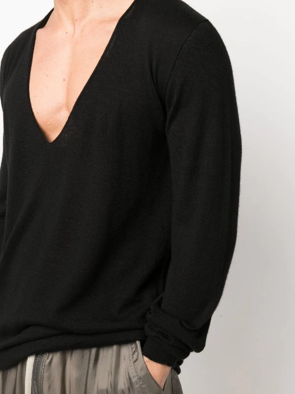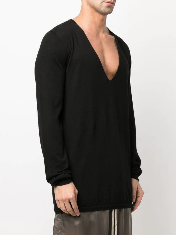 Col v profond, maille fine, manches longues, poignets nervurés, ourlet nervuré, coupe longue. Couleur : noir. Matière : cachemire.
