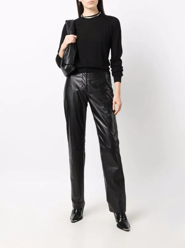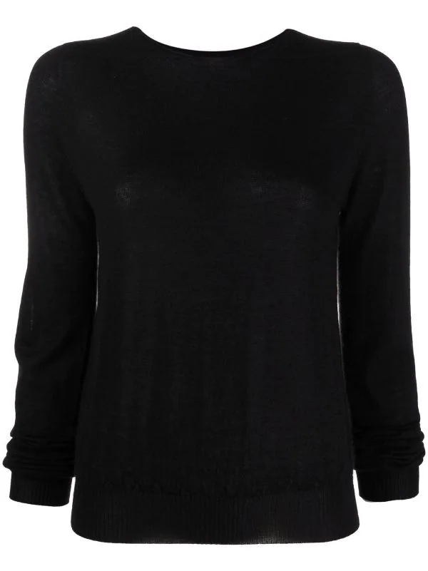 Maille fine, encolure ronde, manches longues, ourlet nervuré. Couleur : noir. Matière : cachemire.