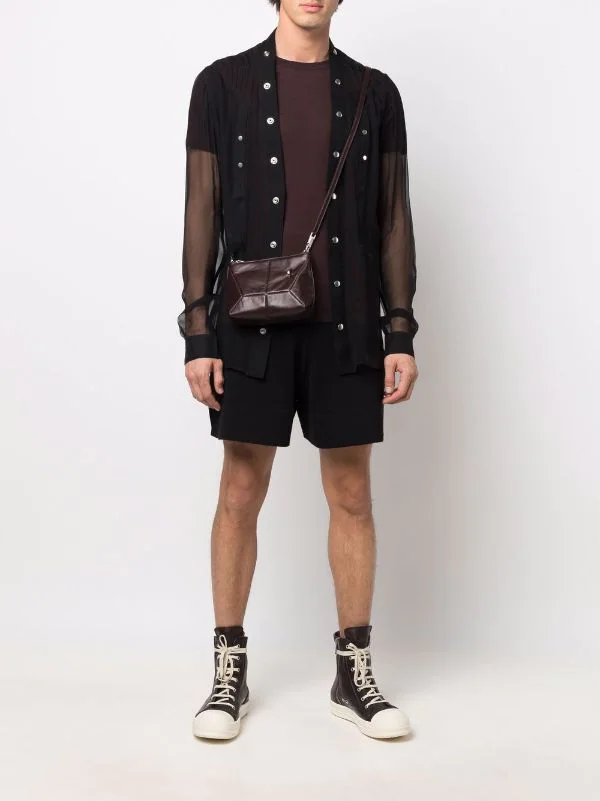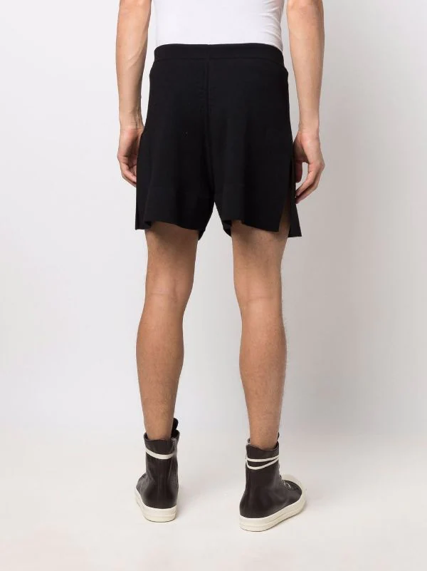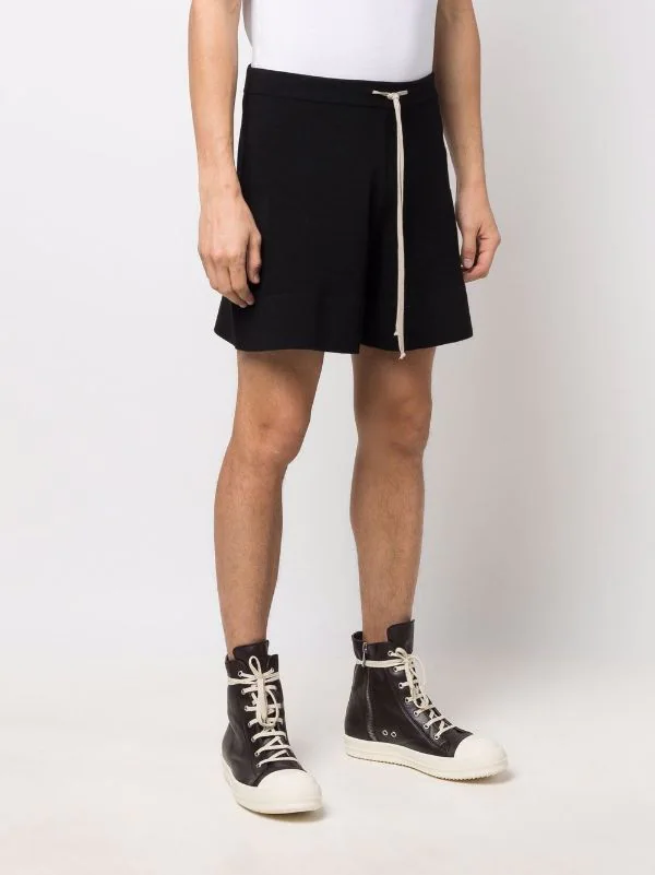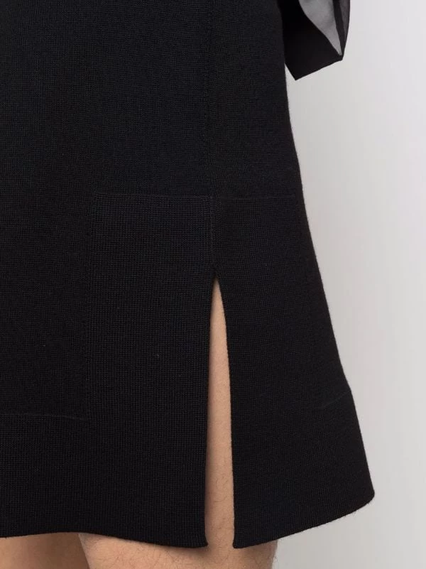 Taille mi-haute, coupe droite, taille élastique à lien de resserrage, fentes latérales, longueur au dessus du genou. Couleur : noir.
