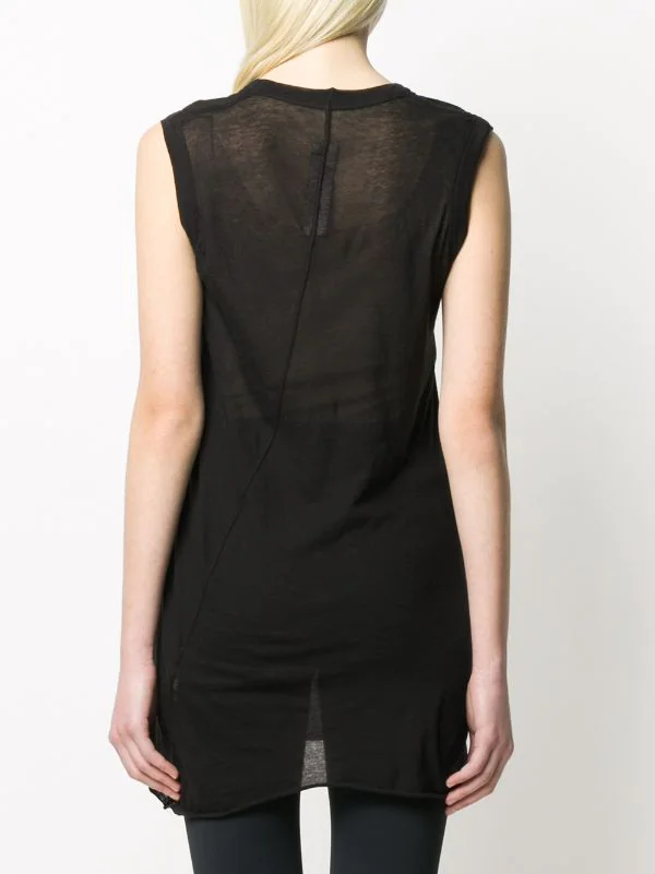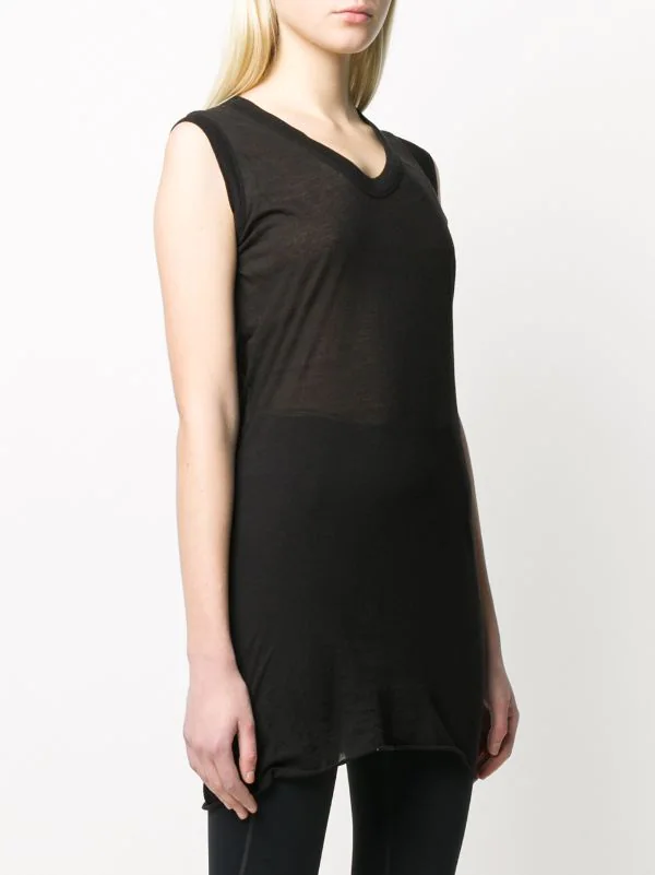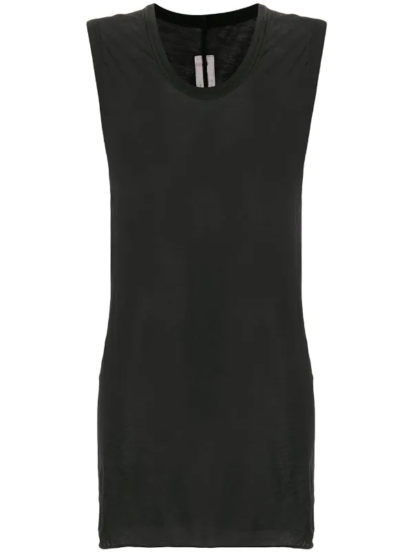 T-shirt à ourlet drapé en coton Rick Owens avec encolure ronde, un design sans manches, a fine knit et ourlet à bord-franc irrégulier. Couleur : noir.