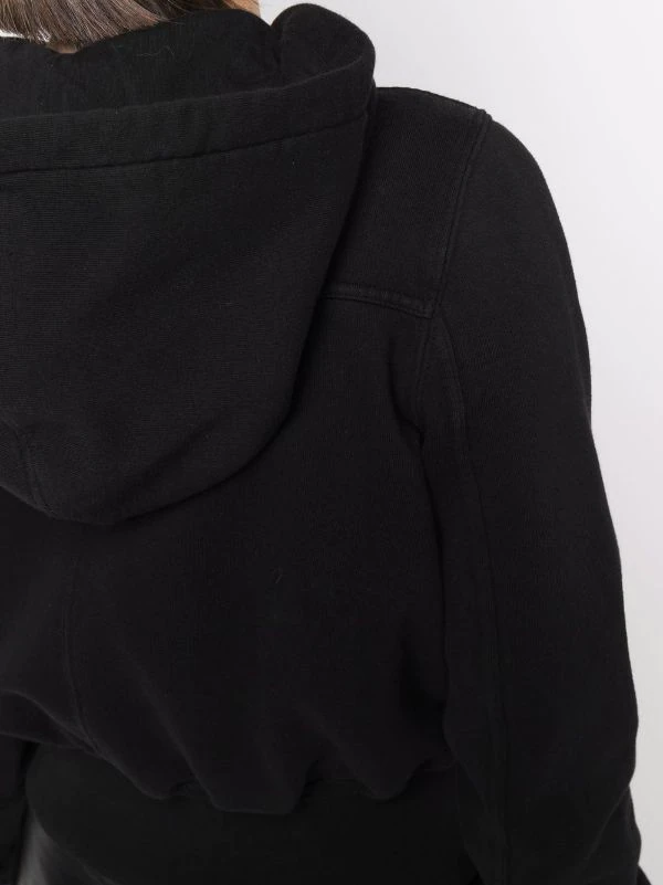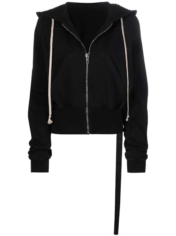 Détail nervuré, capuche à lien de resserrage, fermeture zippée devant, manches longues, poche plaquée. Couleur : noir. Matière : coton.