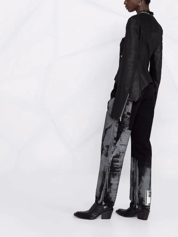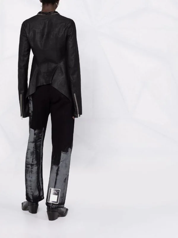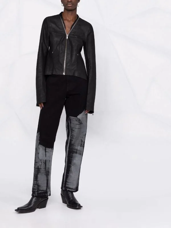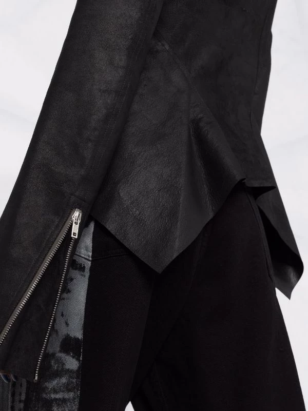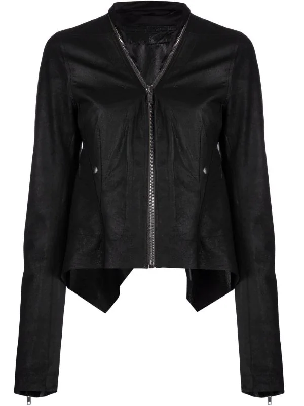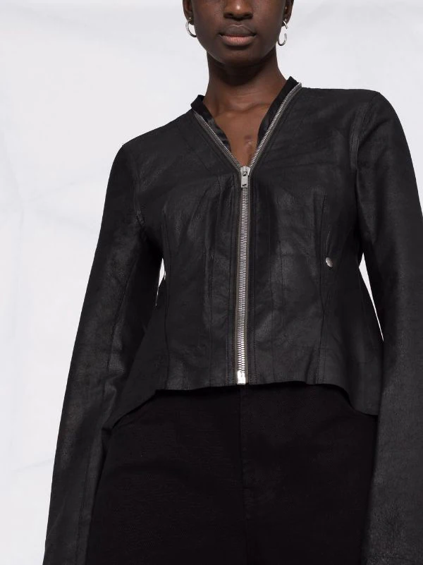 Col v, fermeture zippée devant, manches longues, manches à poignets resserrés, ourlet péplum. Couleur : noir. Matière : peau d’agneau.