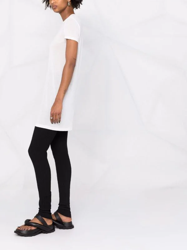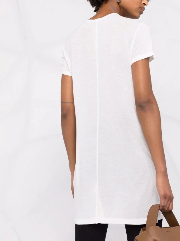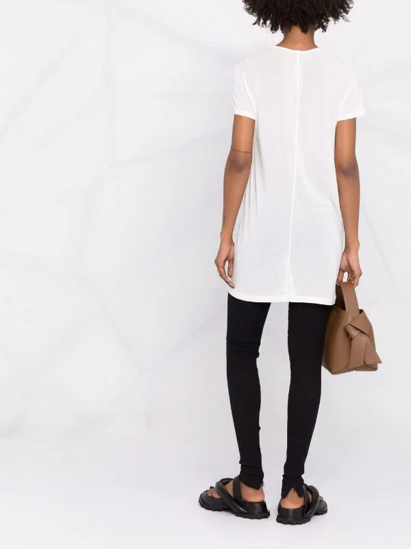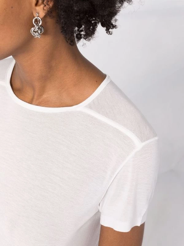 Détails de coutures apparentes, effet de transparence, maille fine, encolure ronde, manches courtes, ourlet droit.