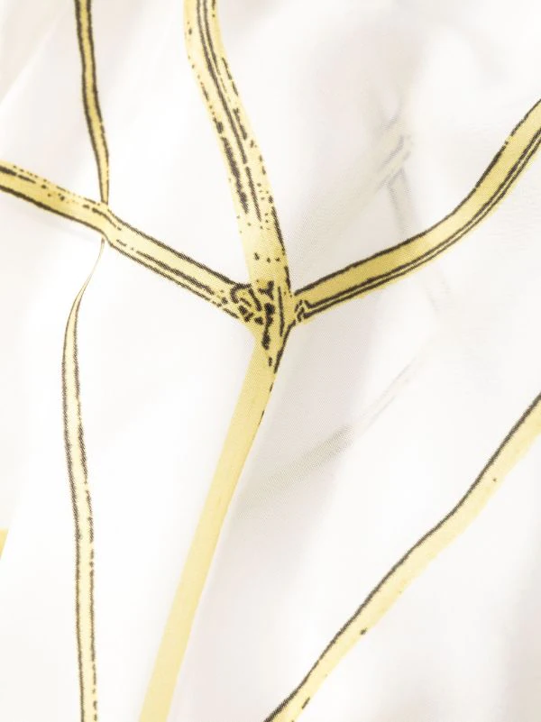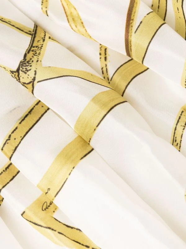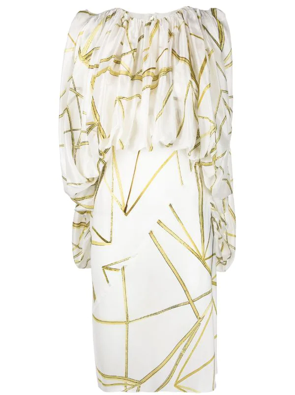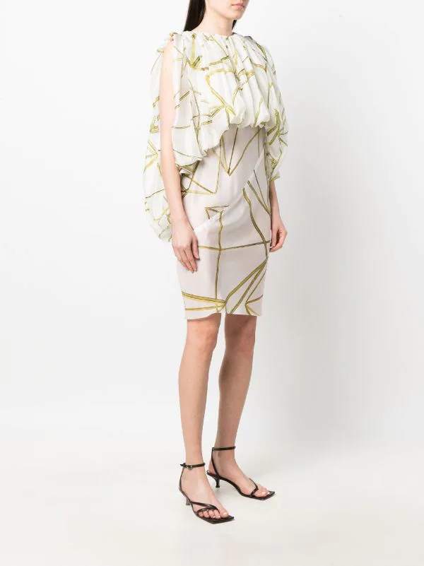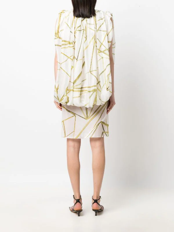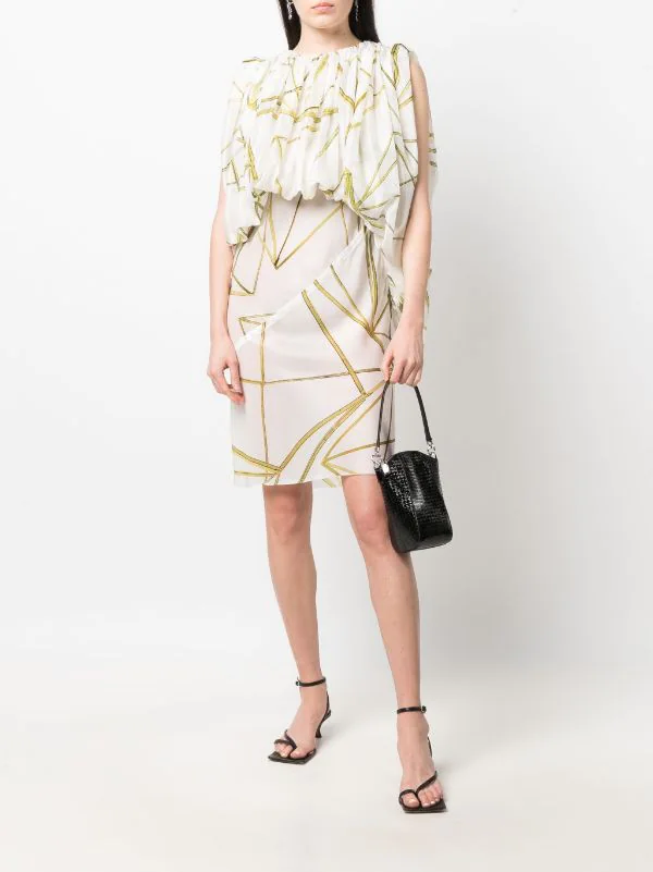 Imprimé graphique intégral, détails de fronces, design drapé, encolure ronde, design sans manches, hauteur genou.
