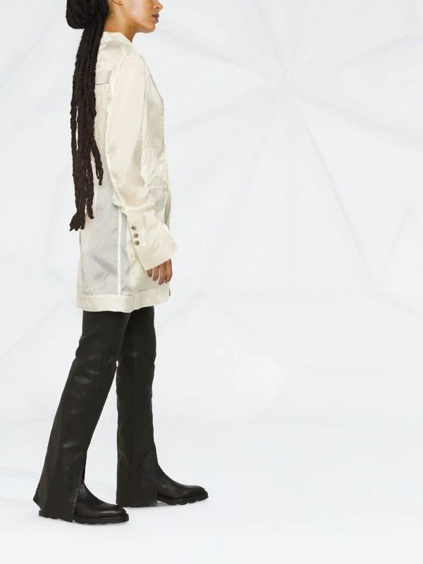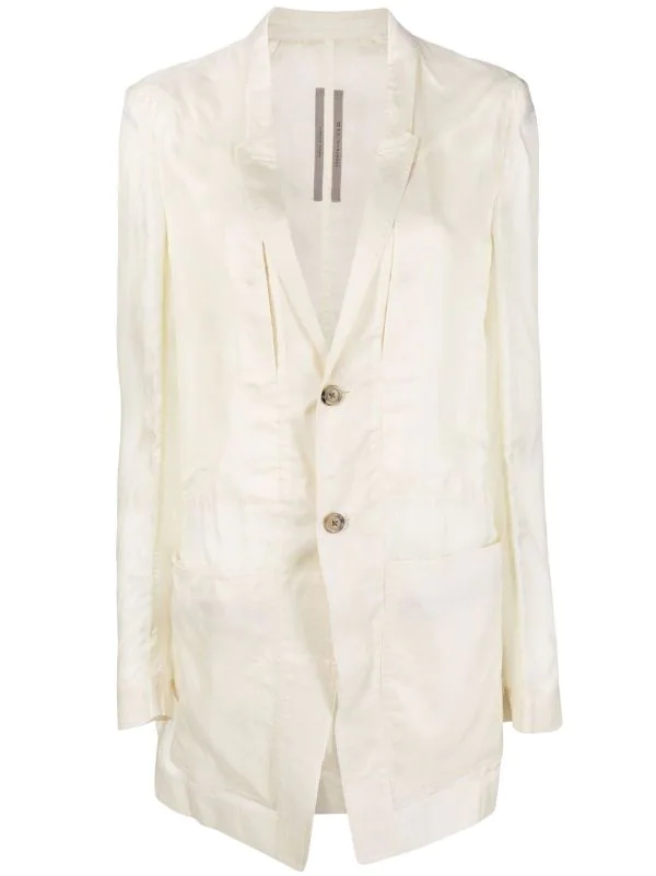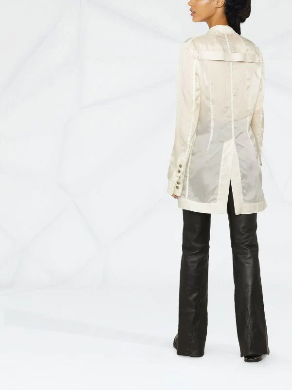 Revers crantés, manches longues, boutonnière sur le devant, deux poches plaquées avant, détails de brides. Couleur : tons neutres.