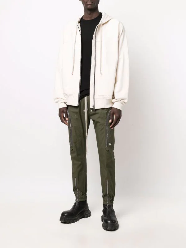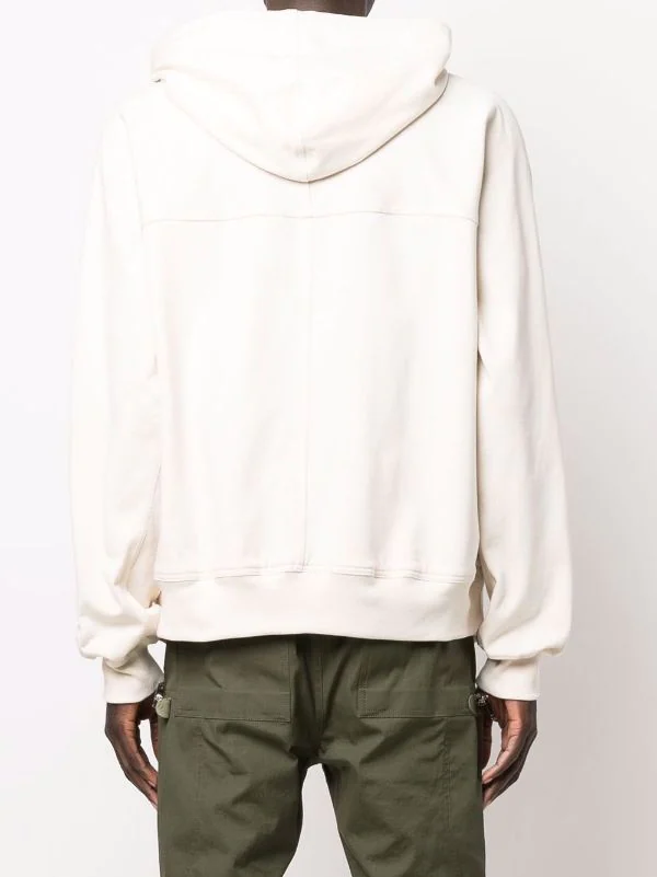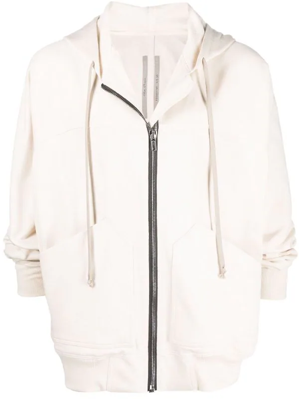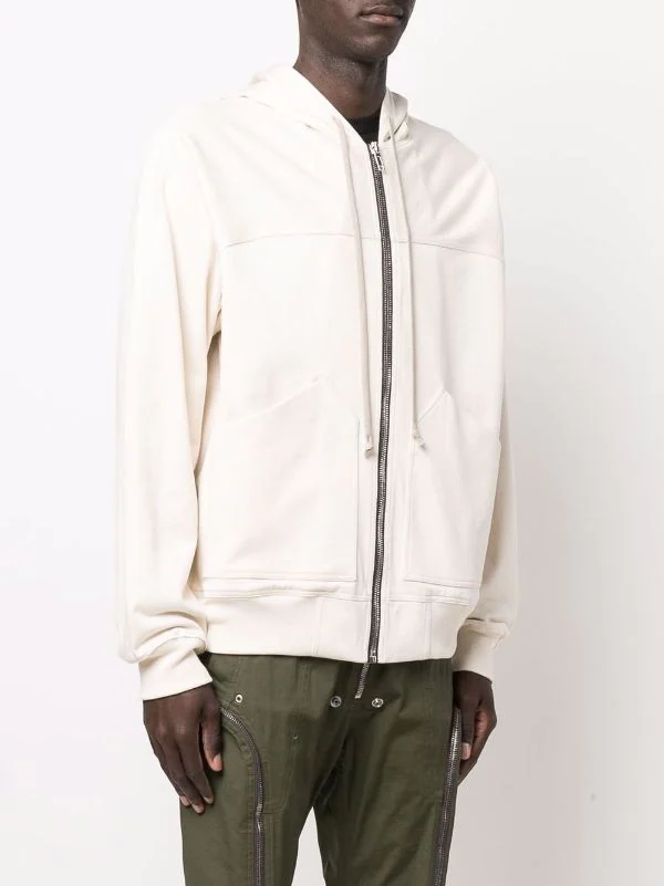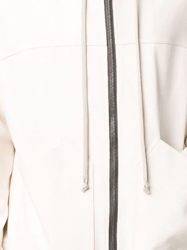 Capuche à lien de resserrage, fermeture zippée devant, deux poches à rabat, manches longues, ourlet droit. Couleur : blanc. Matière : coton.