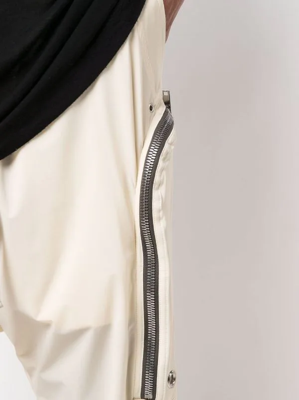 Coupe courte, entrejambe sarouel, taille élastique à lien de resserrage, fermeture zippée devant, deux poches latérales zippées. Couleur : blanc.