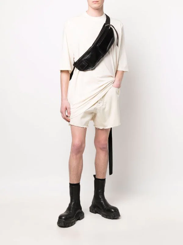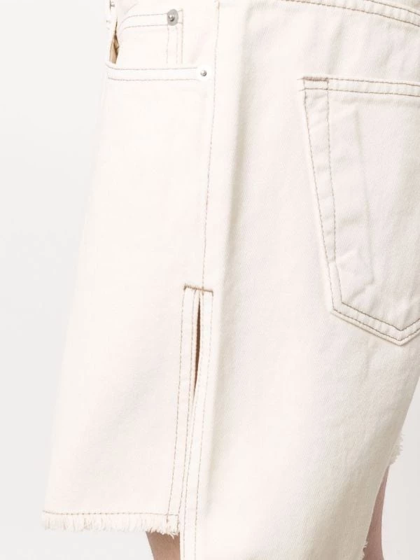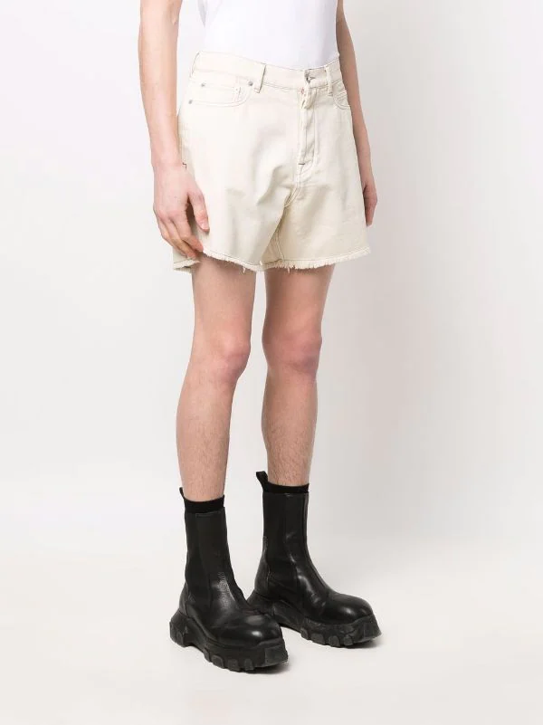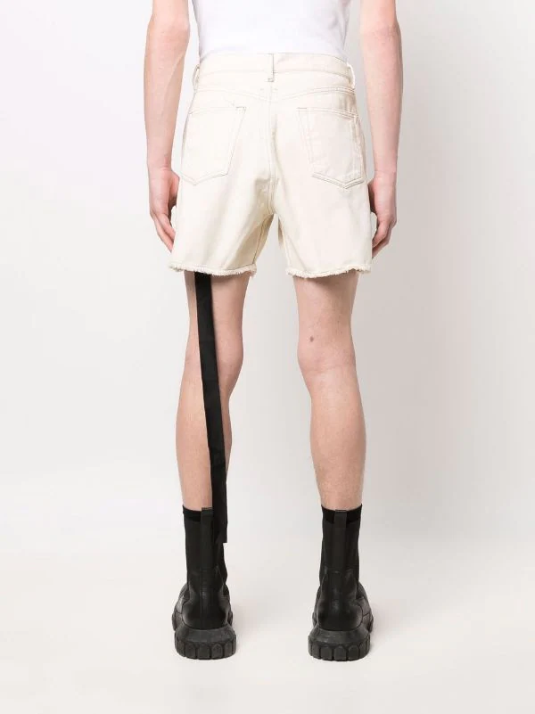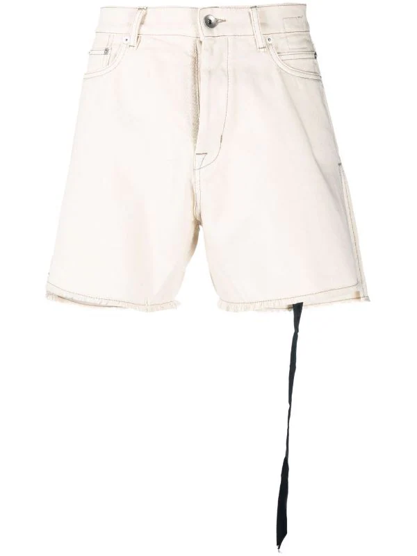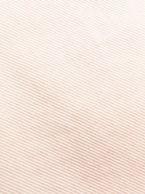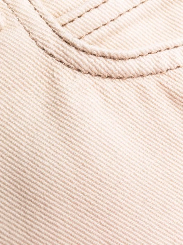 Bords frangés, coutures contrastantes, taille mi-haute, passants de ceinture, fermeture à zip et boutons sur le devant, cinq poches classiques. Matière : coton biologique.