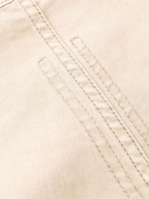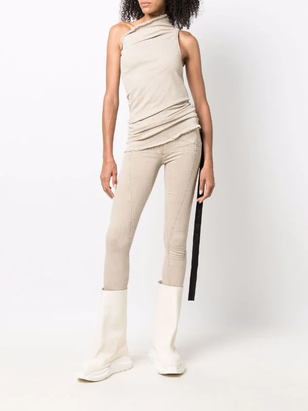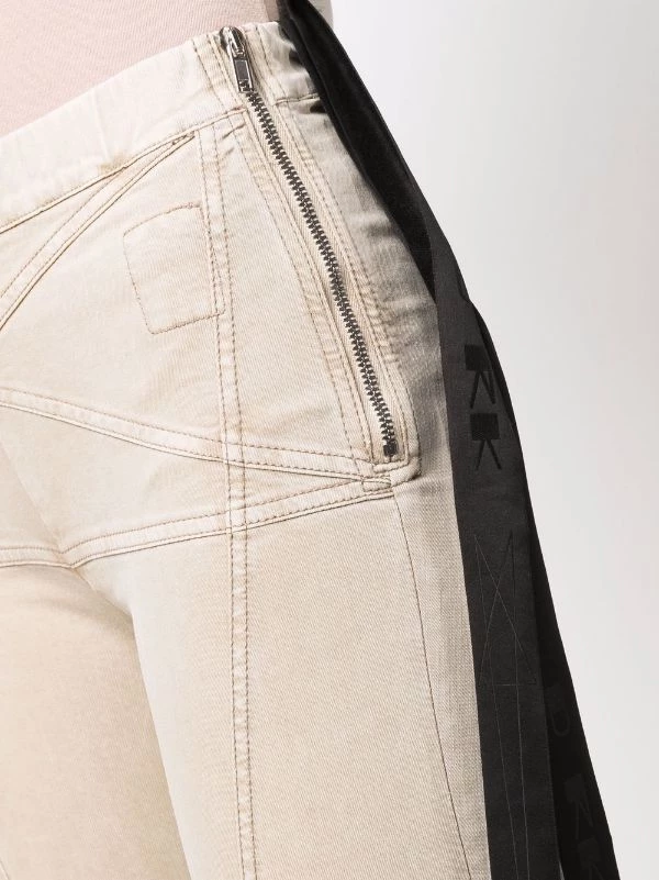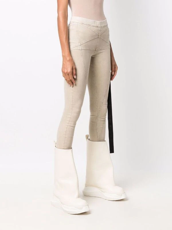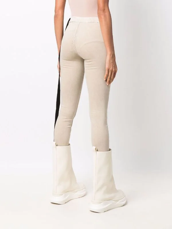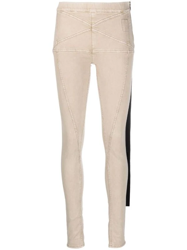 Coutures contrastantes, design à empiècements, fermeture zippée sur le côté, taille haute, coupe skinny. Matière : coton.