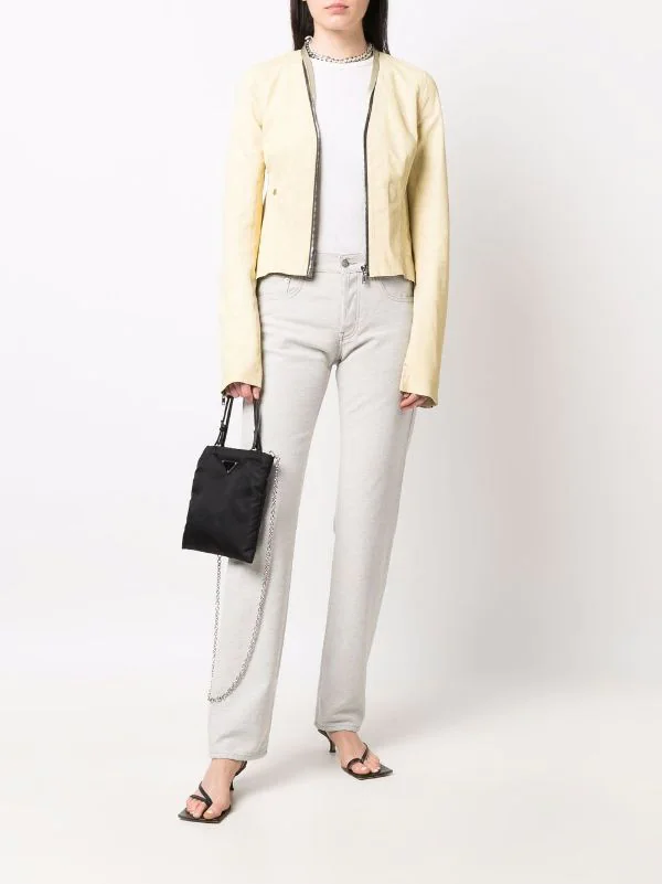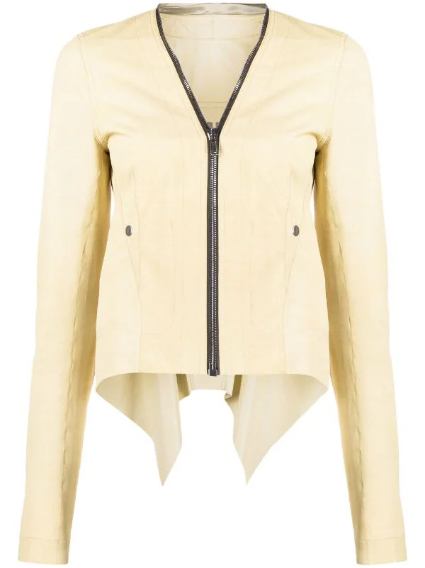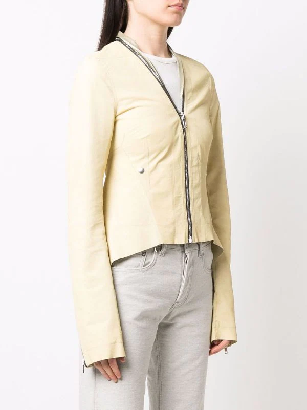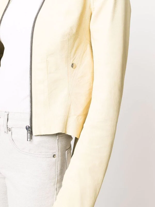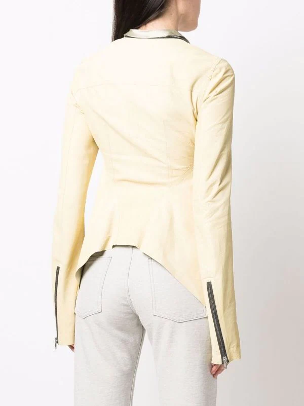 Col v, fermeture zippée devant, manches longues, manches à poignets resserrés, ourlet péplum. Couleur : jaune. Matière : peau d’agneau.
