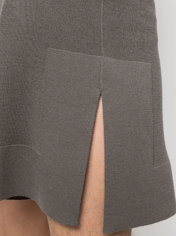 Taille mi-haute, taille élastique à lien de resserrage, coupe ample, fentes latérales, longueur au dessus du genou.