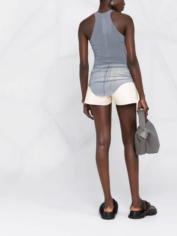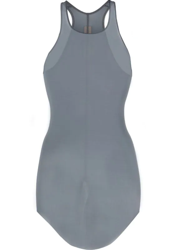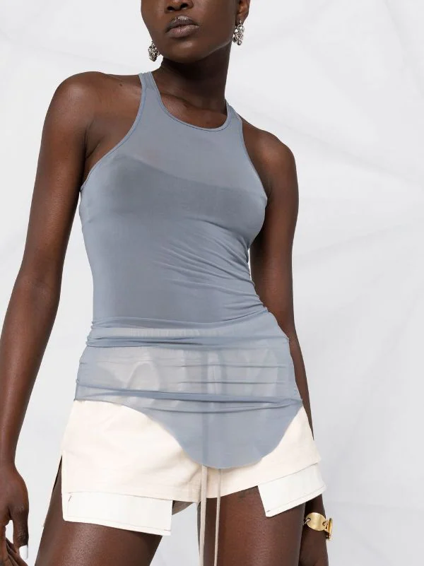 Coupe slim, ourlet asymétrique, encolure ronde, design sans manches. Couleur : bleu.