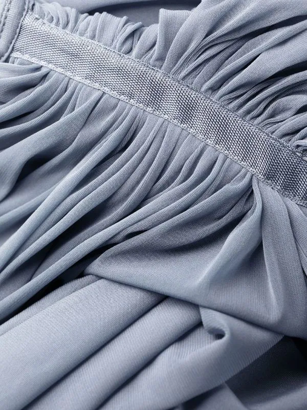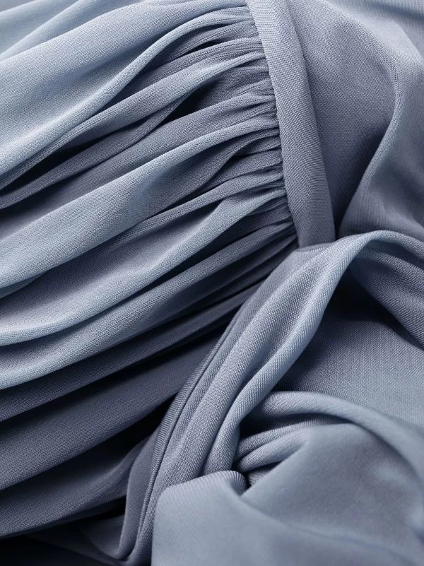 Bleu, détail drapé, détails de découpes, épaules dénudées, taille ajustée, coupe mi-longue.
