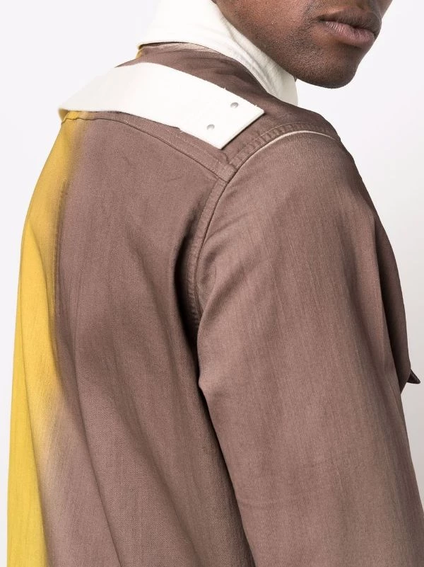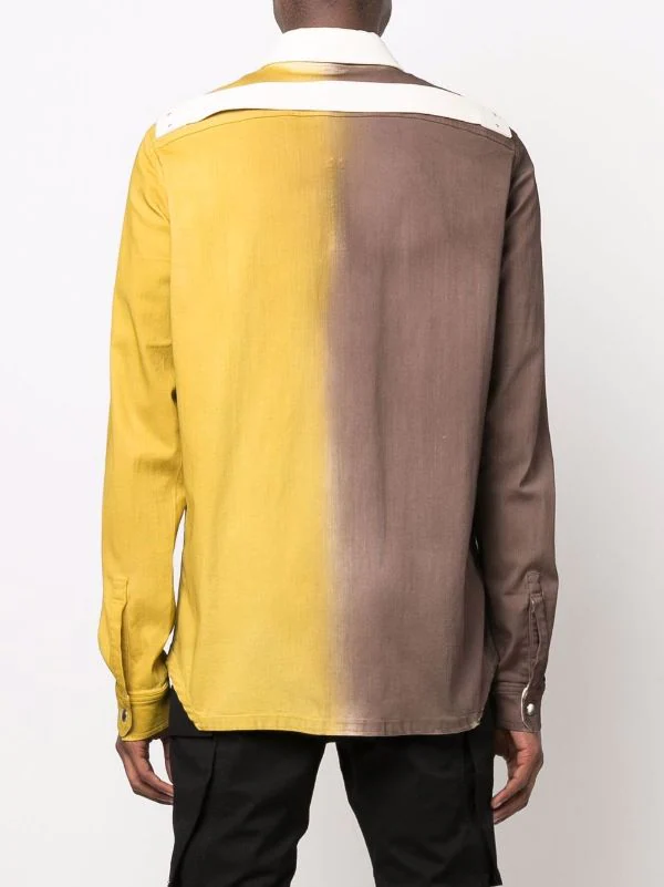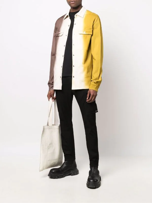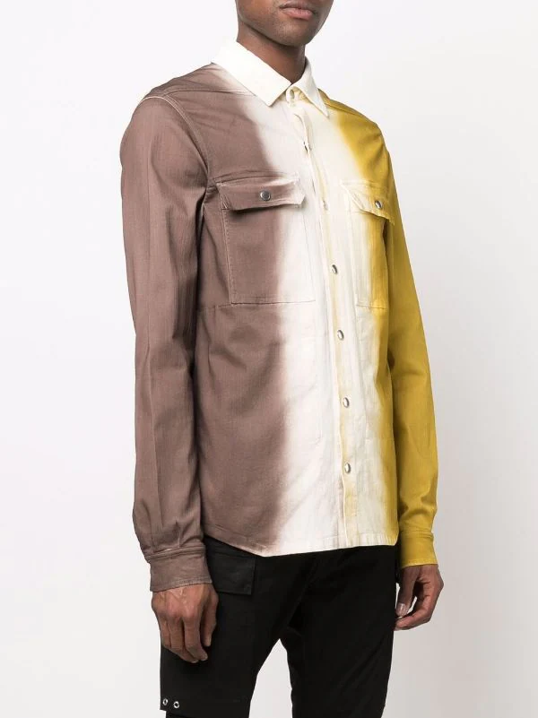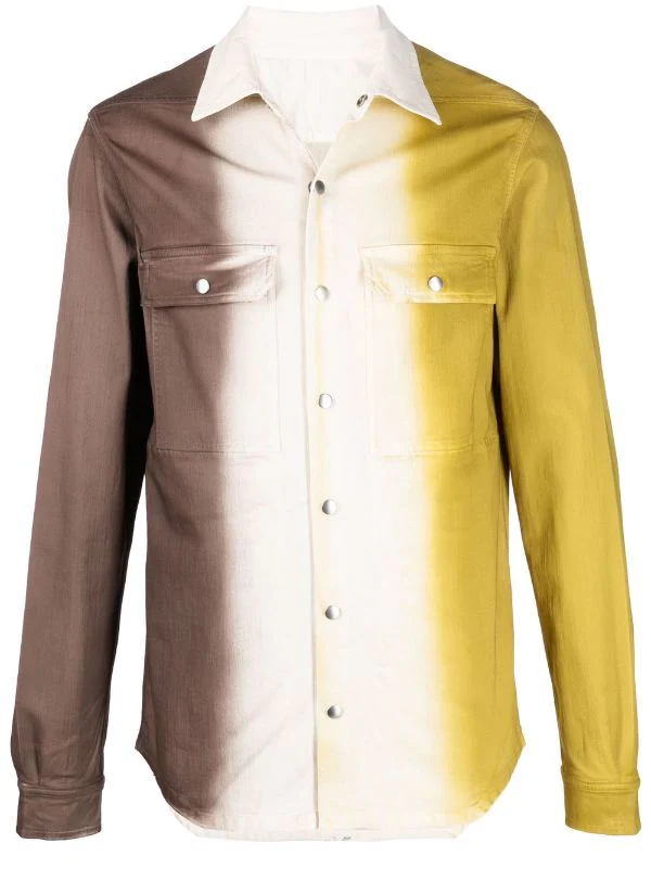 Imprimé tie dye, col pointu, boutonnière sur le devant, manches longues, poignets boutonnés, deux poches poitrine à rabat, ourlet incurvé. Matière : coton.