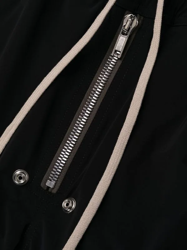 Détails d’œillets, détails zippés, deux poches latérales zippées, lien de resserrage à la taille, coupe droite. Couleur : noir.