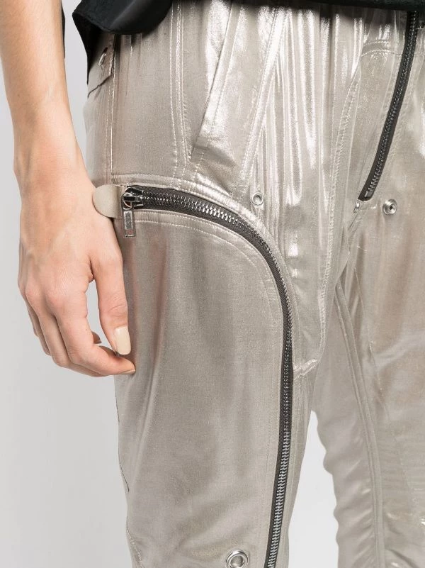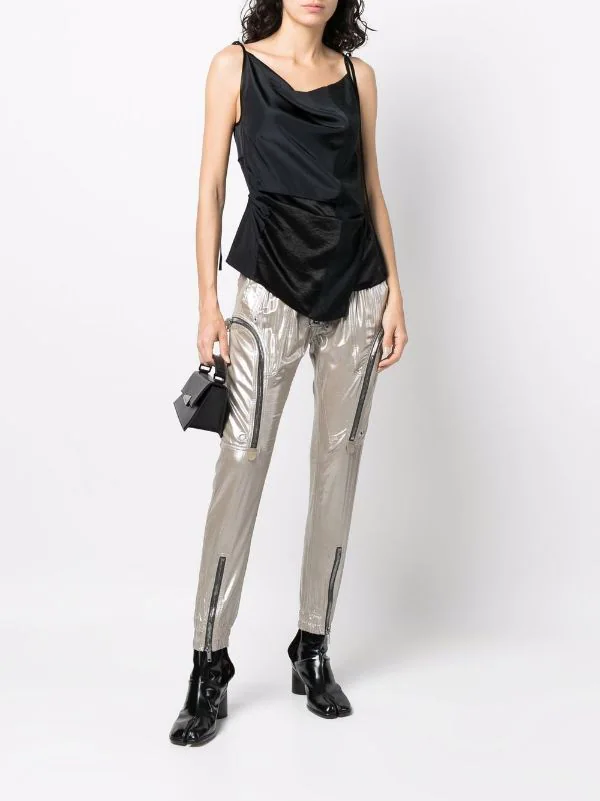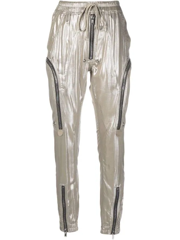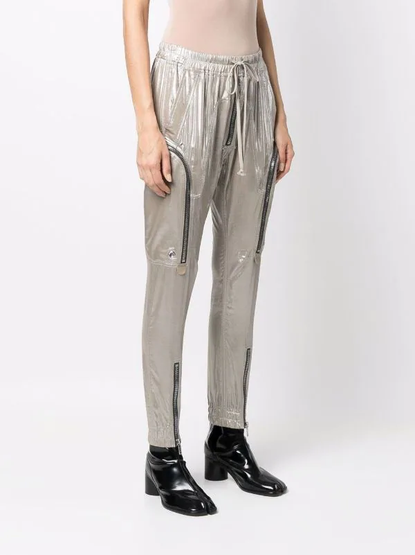 Fini métallisé, taille élastique à lien de resserrage, poches plaquées latérales, coupe fuselée, détails zippés.