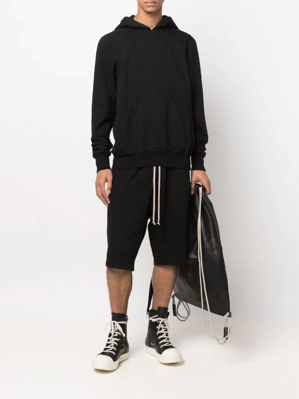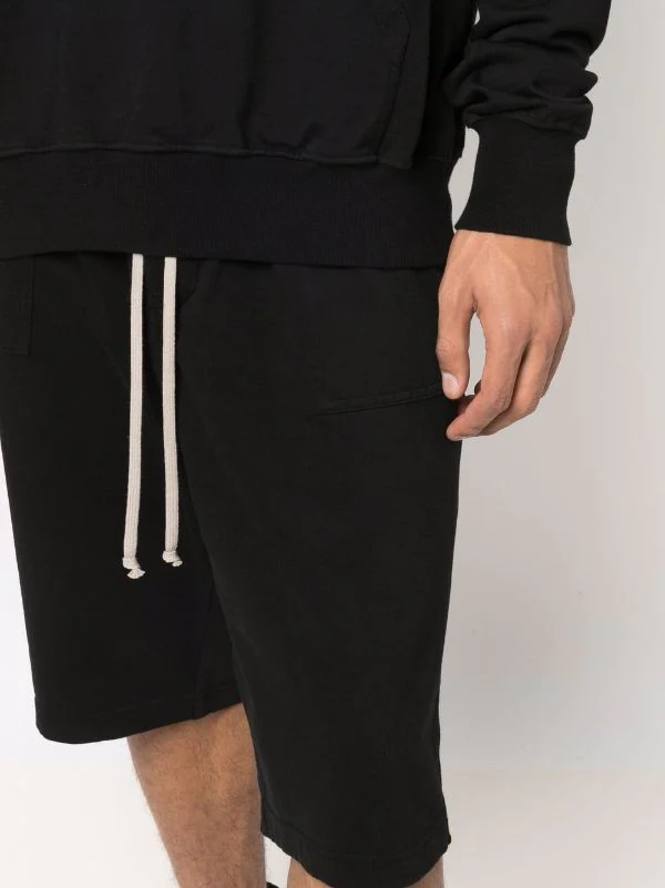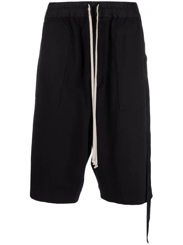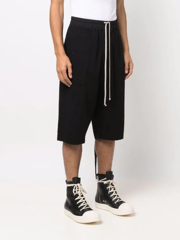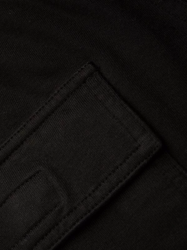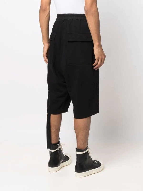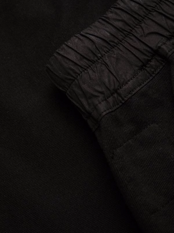 Taille élastique à lien de resserrage, deux poches latérales fendues, poches arrière à rabat, coupe droite. Couleur : noir. Matière : coton.