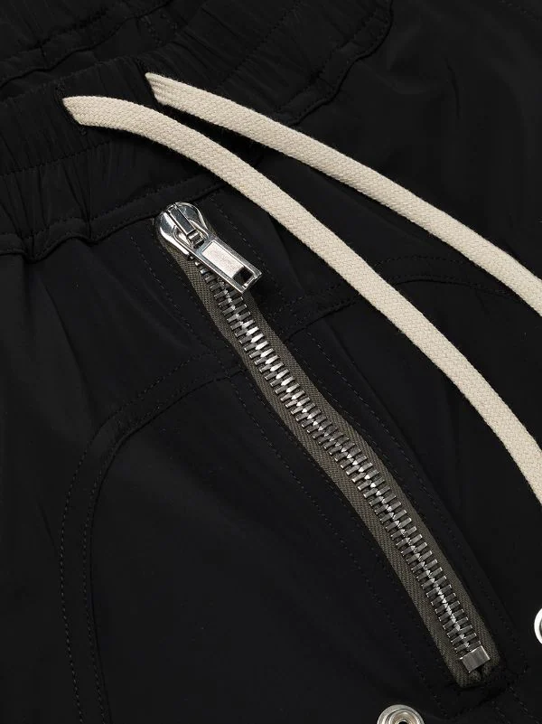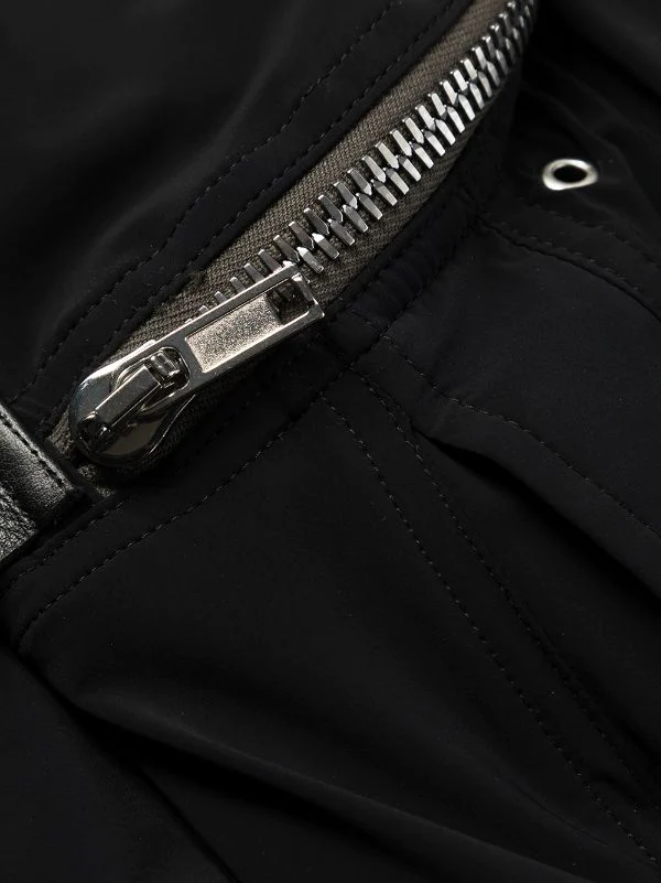 Détails zippés, taille élastique à lien de resserrage, coutures ton sur ton, poches plaquées latérales, finitions en métal argenté, coupe fuselée, poignets élastiqués, poches arrière à rabat. Couleur : noir.