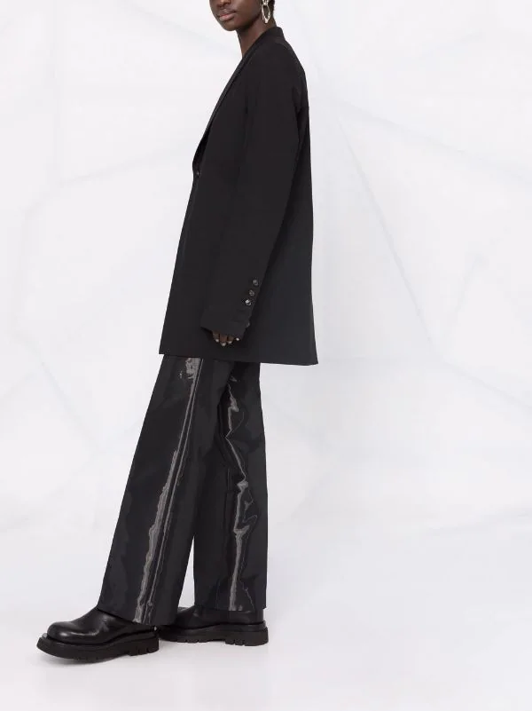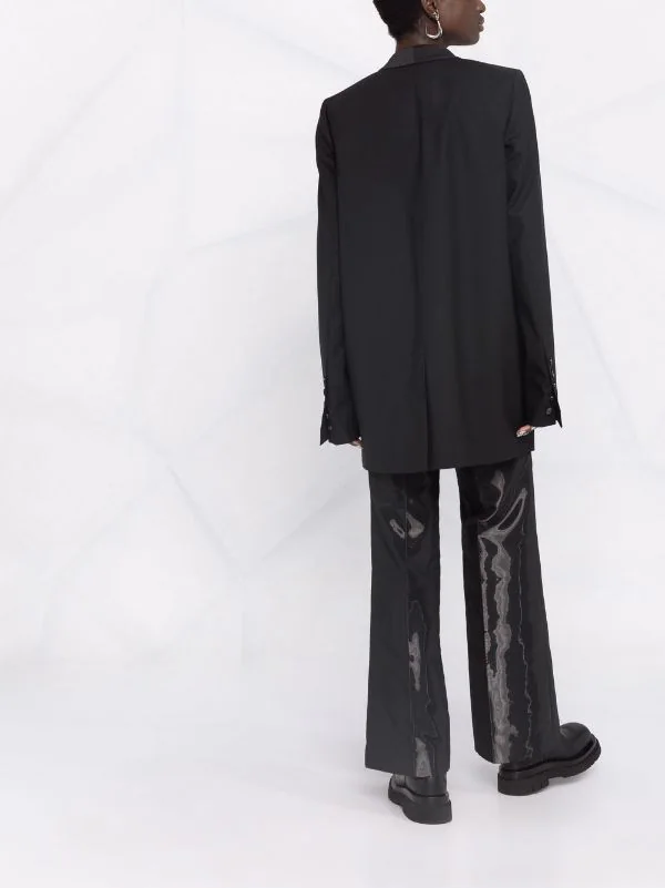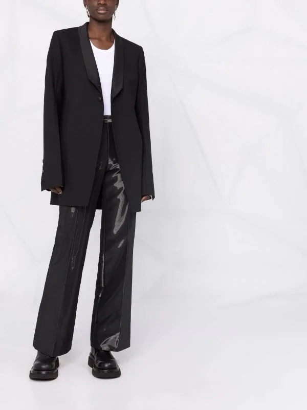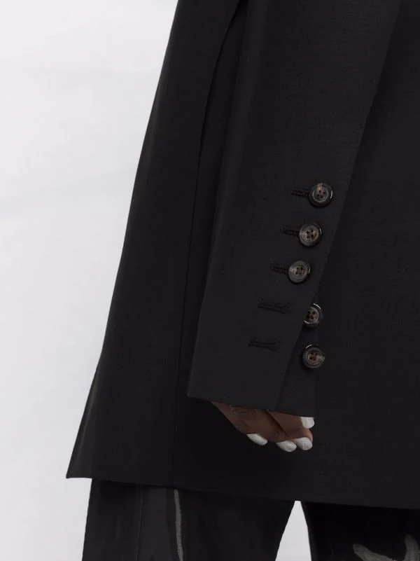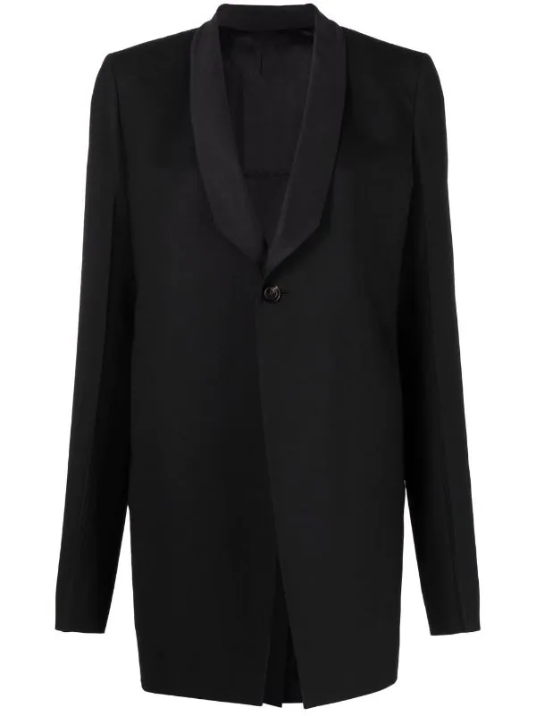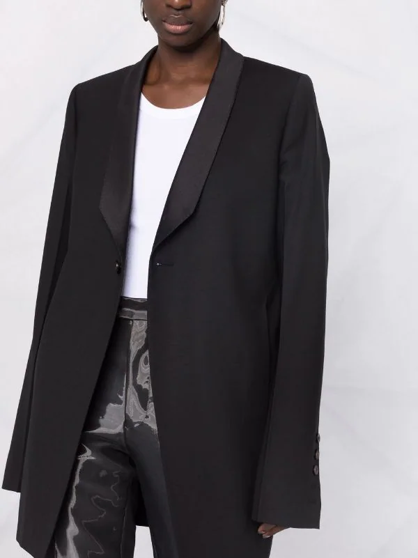 Fermeture boutonnée, col châle, poignets boutonnés, fente arrière centrale, doublure intégrale. Couleur : noir.