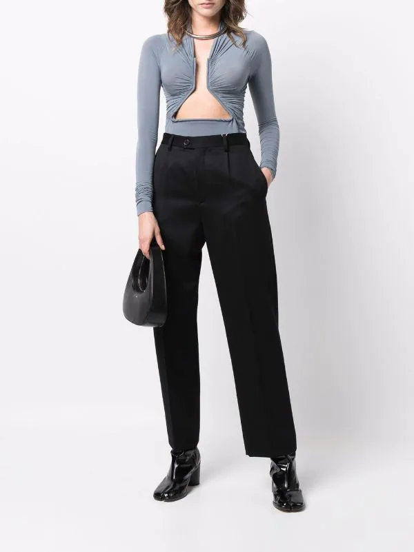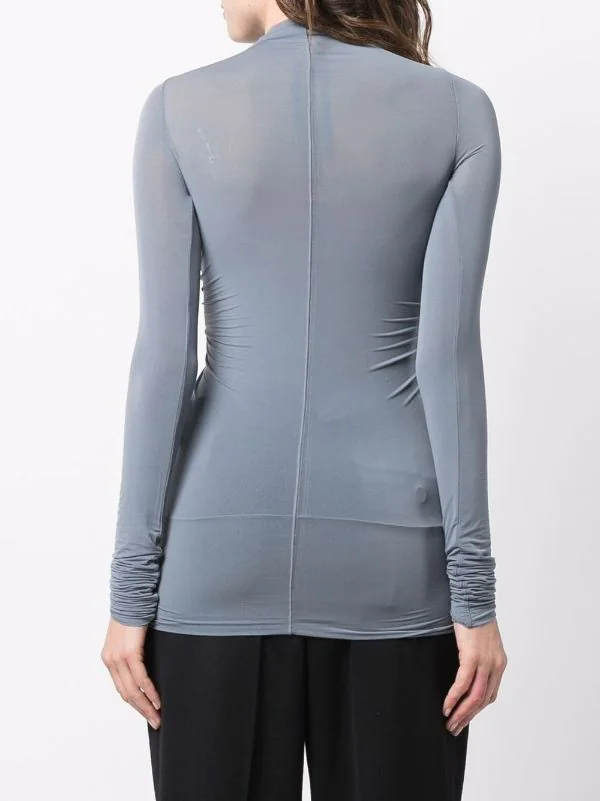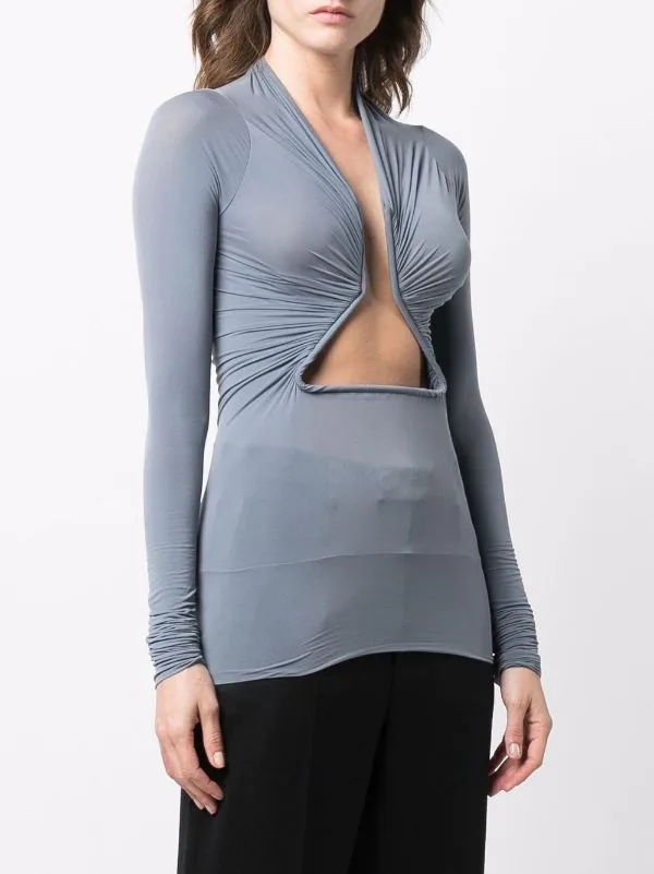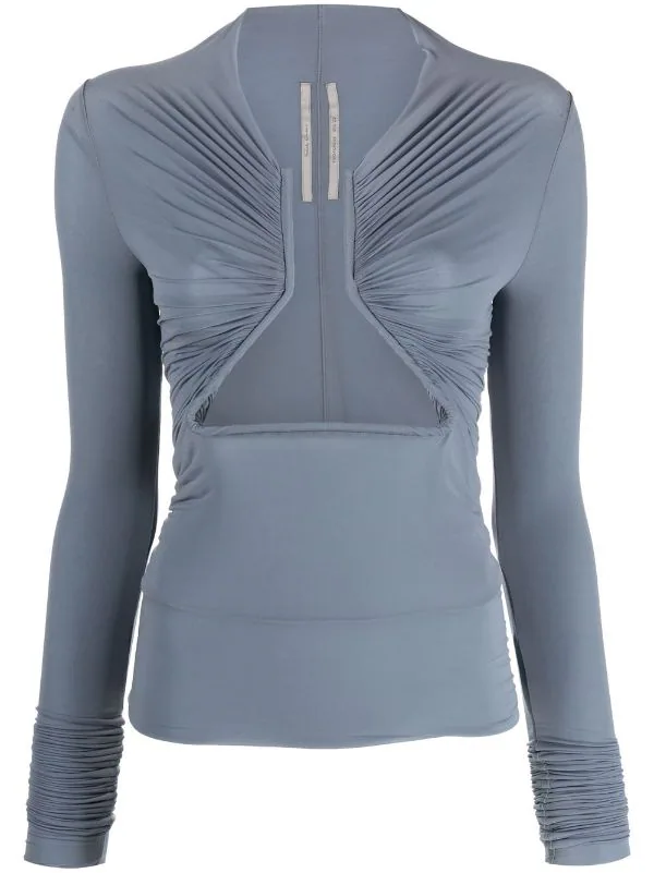 Détails de découpes, détails de fronces, col v profond, manches longues. Couleur : bleu.