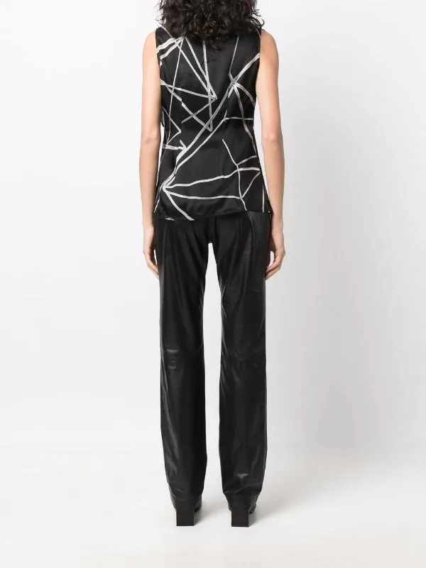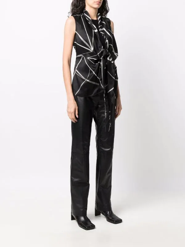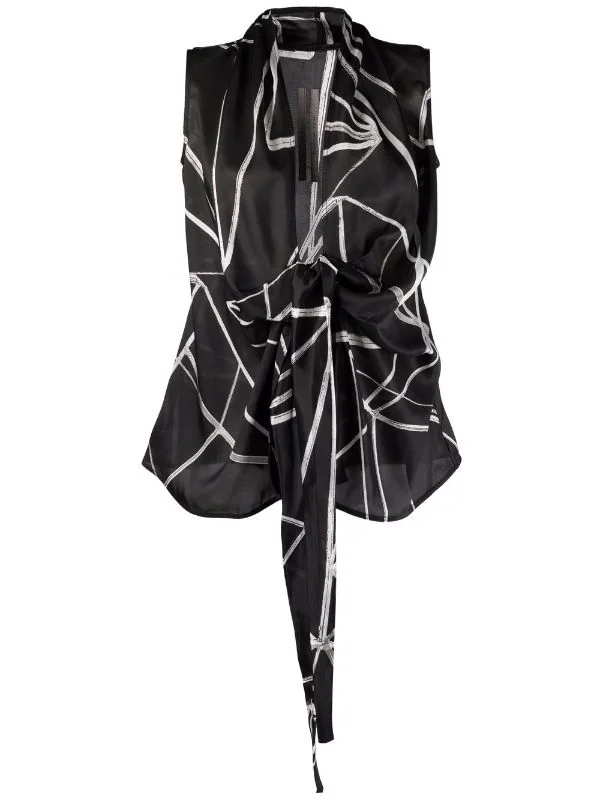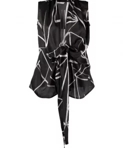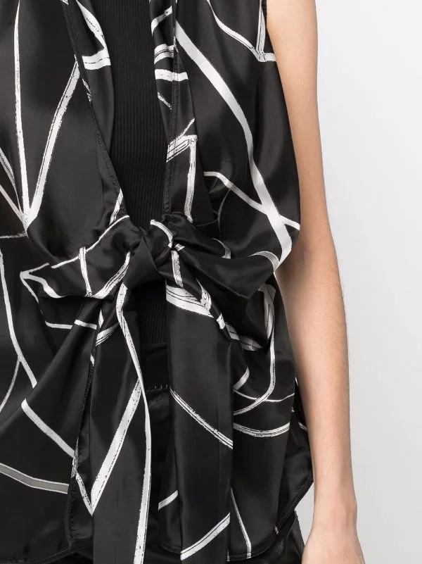Imprimé graphique intégral, taille nouée, design sans manches. Couleur : noir.