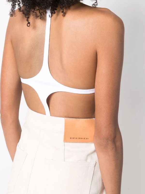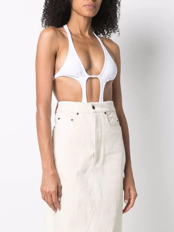 Détails de découpes, bonnets triangles, construction stretch. Couleur : blanc.