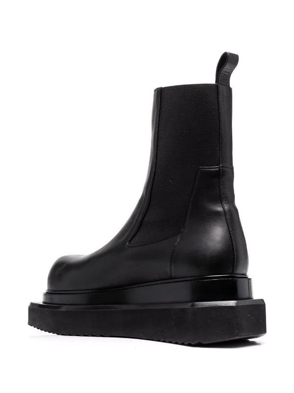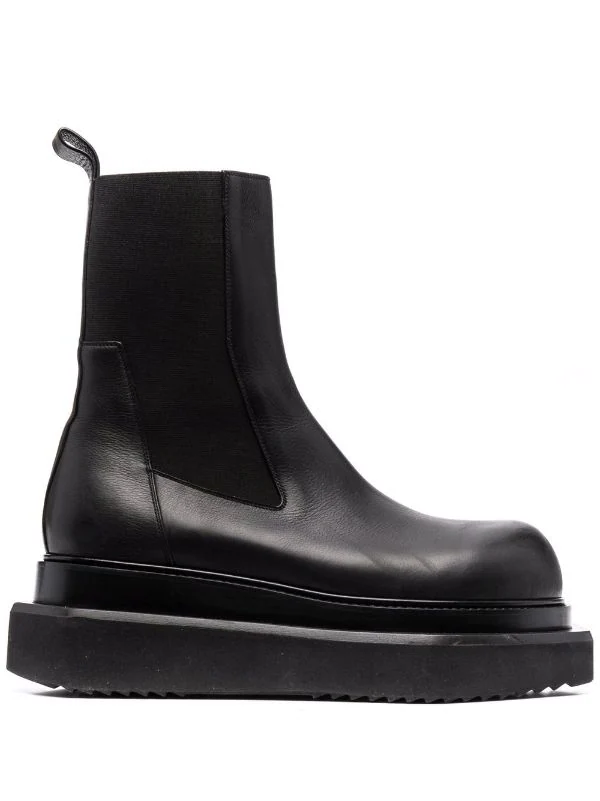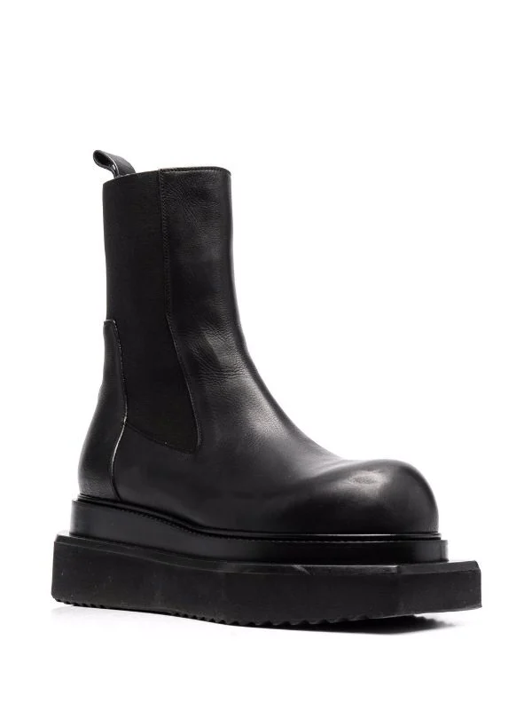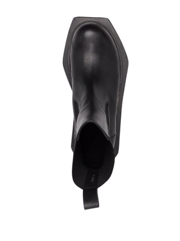 Hauteur cheville, languette d’enfilage au talon, empiècements élastiqués sur les côtés, bout rond, semelle à plateforme. Couleur : noir. Matière : cuir.