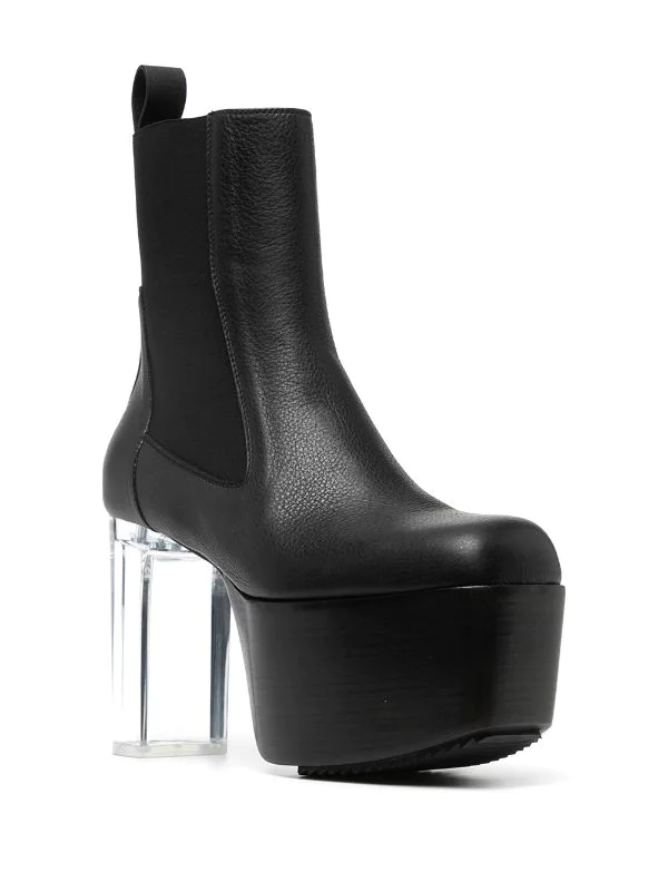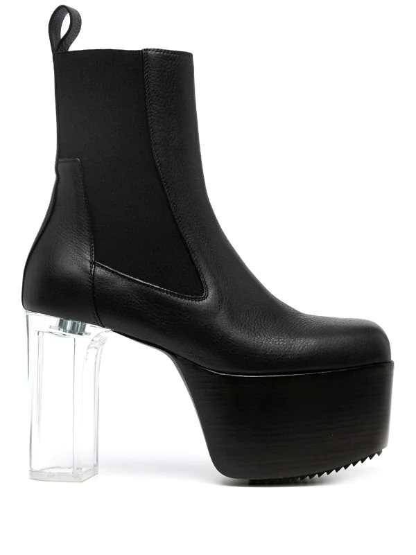 Bout carré, semelle à plateforme, empiècements élastiqués sur les côtés, languette d’enfilage à logo au talon, talon épais transparent. Couleur : noir. Matière : cuir.