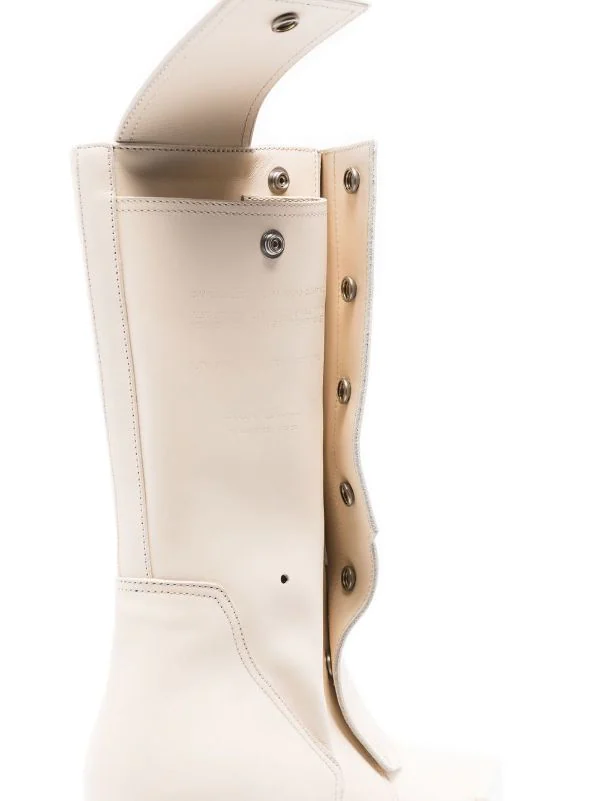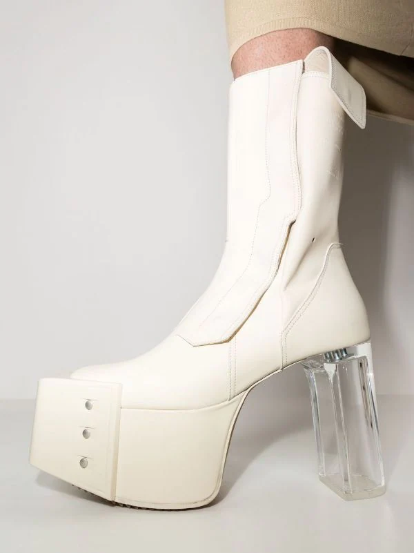Lait, cuir, design à empiècements, fermeture zippée sur le côté, hauteur cheville, bout carré, talon épais transparent.