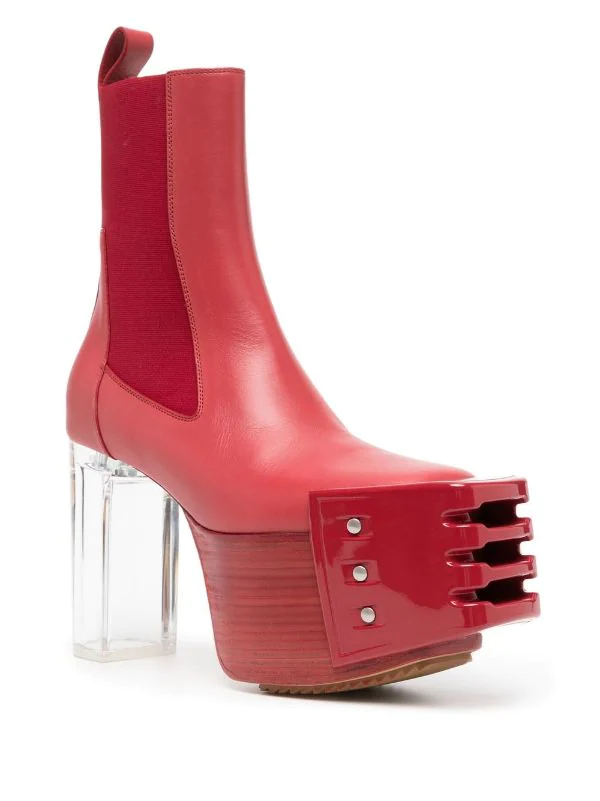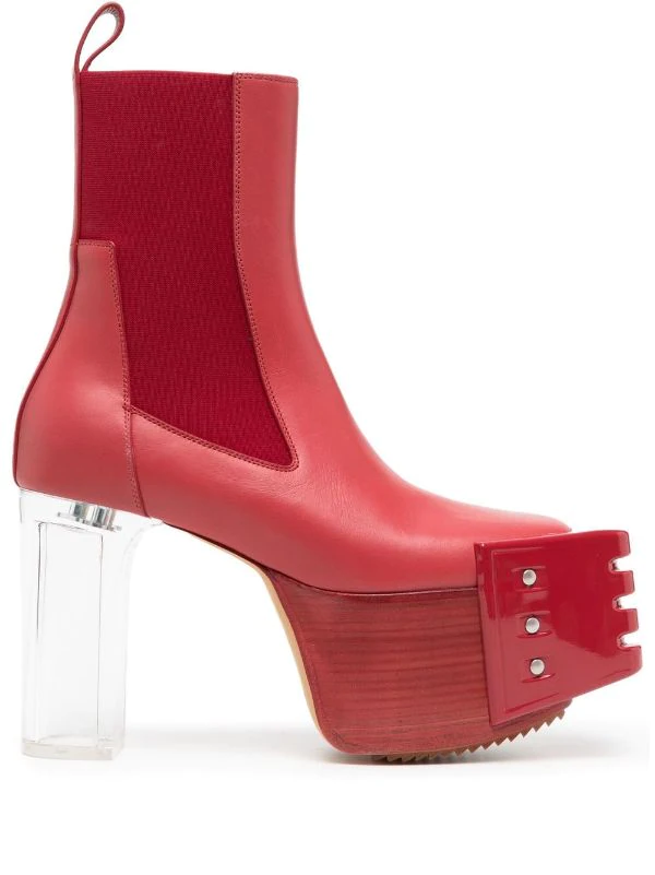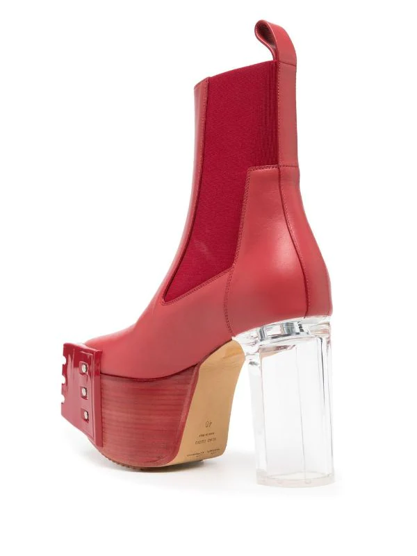 Rouge cardinal, cuir, semelle à plateforme, empiècements élastiqués sur les côtés, languette d’enfilage au talon, talon épais transparent.