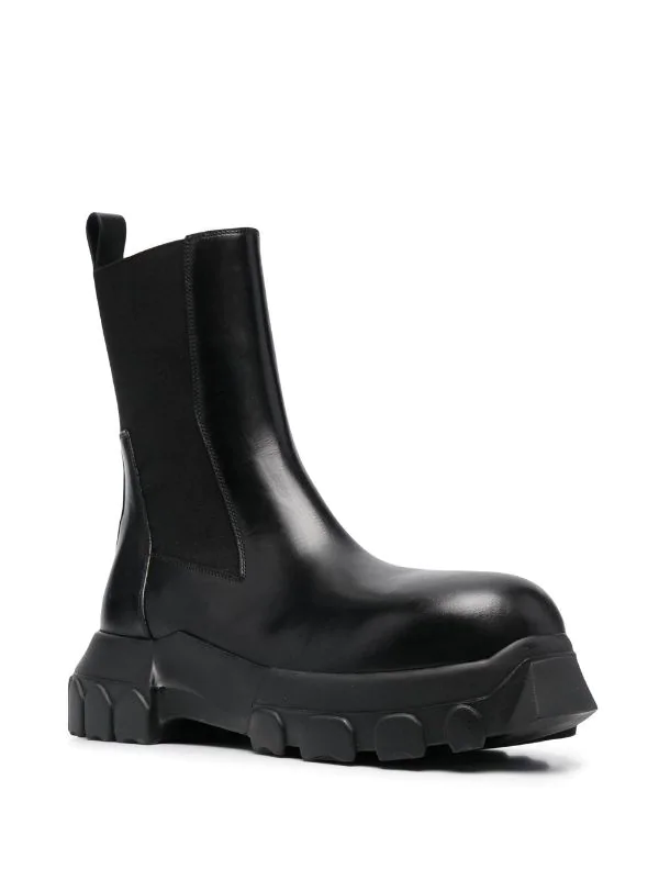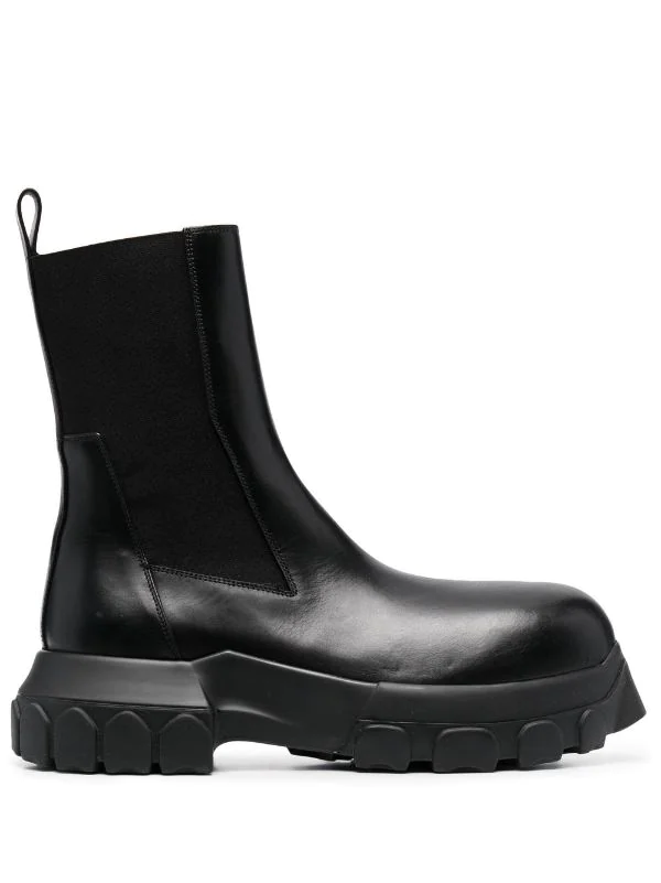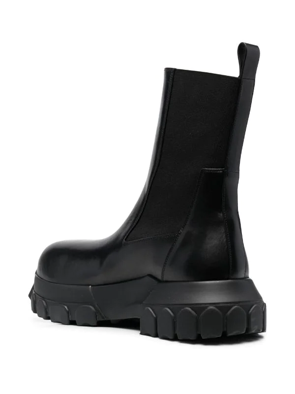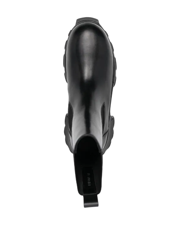 Bout rond, fini mat, empiècements élastiqués sur les côtés, languette d’enfilage au talon, semelle à plateforme. Couleur : noir. Matière : cuir.