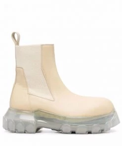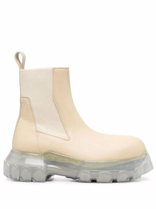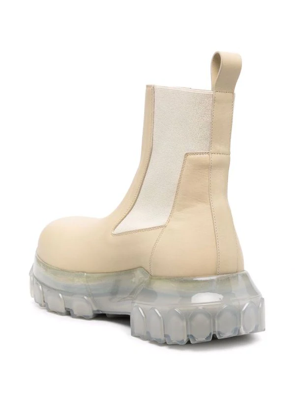 Empiècements élastiqués sur les côtés, languette d’enfilage au talon, bout rond, à enfiler, hauteur cheville, talon mi-haut, semelle en caoutchouc transparent. Matière : cuir.