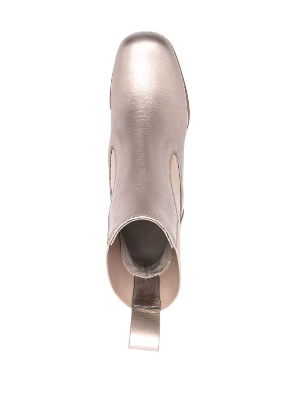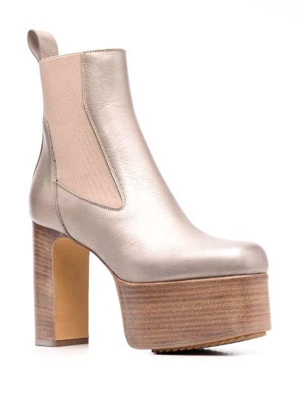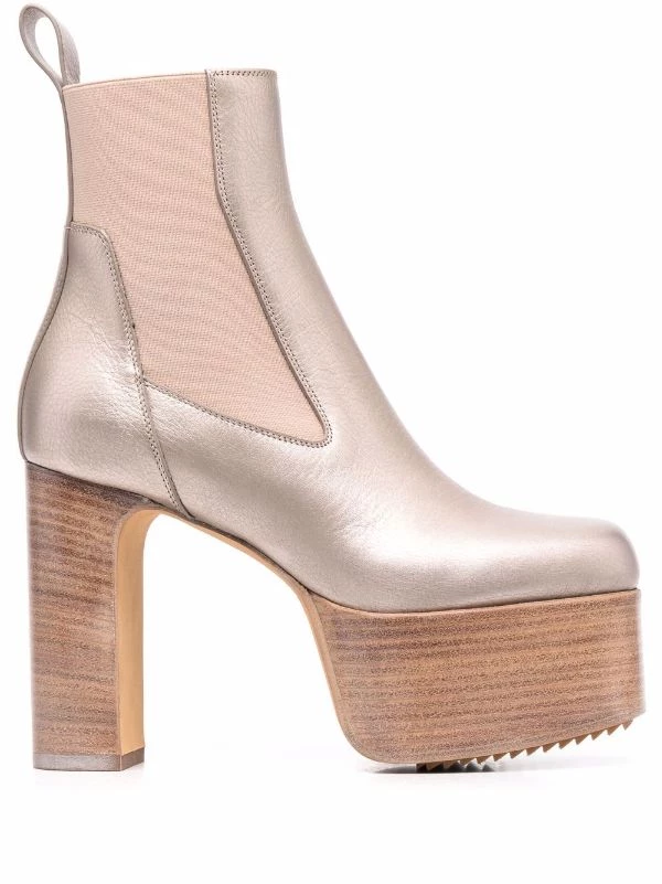 Fini métallisé, bout rond, empiècements élastiqués sur les côtés, languette d’enfilage au talon, talon haut épais, semelle à plateforme. Matière : cuir.
