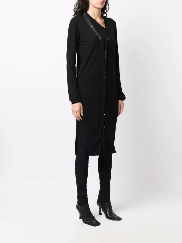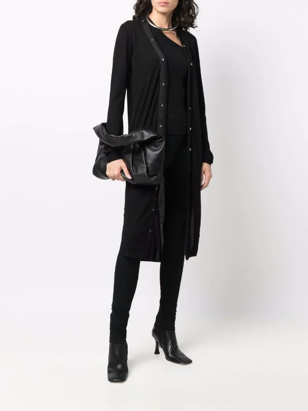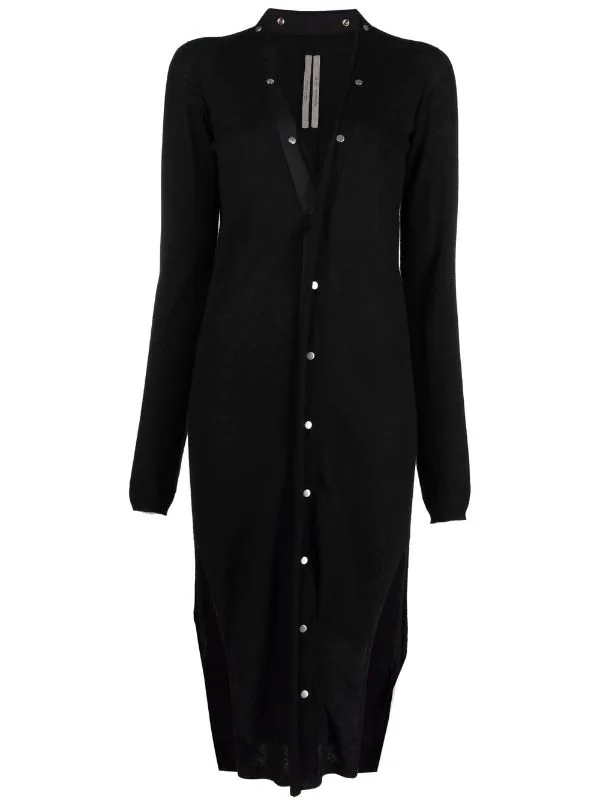 Finitions nervurées, finitions en métal argenté, fermeture à boutons pression, patte de boutonnage sur le devant, manches longues, fentes latérales, coupe mi-longue. Couleur : noir. Matière : cachemire.