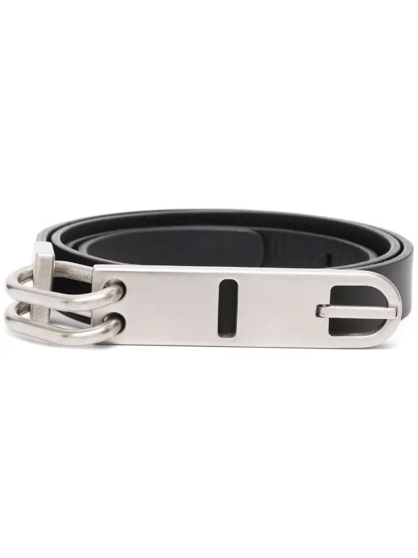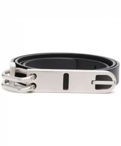 Fermeture à boucle argentée, taille ajustable, coupe skinny. Couleur : noir. Matière : cuir.