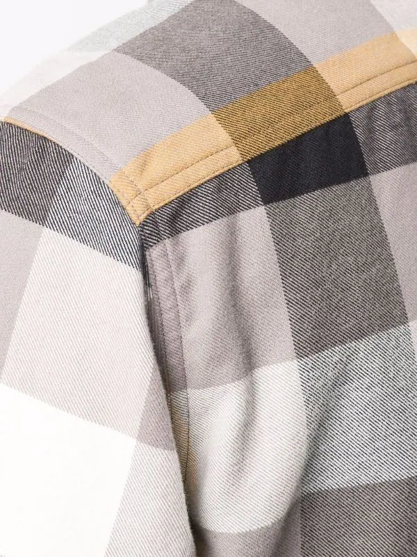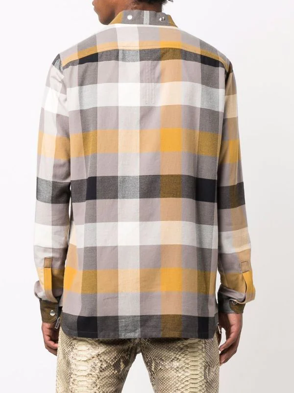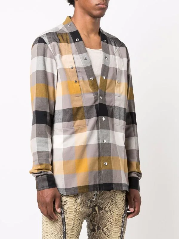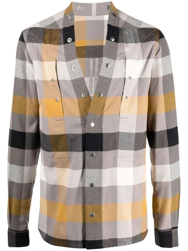 Carreaux, col v, fermeture à boutons pression, manches longues, deux poches poitrine à boutons pression. Couleur : multicolore.