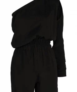 Design asymétrique, design asymétrique à une épaule, détails de découpes, manches longues, deux poches latérales fendues, ceinture élastique. Couleur : noir.