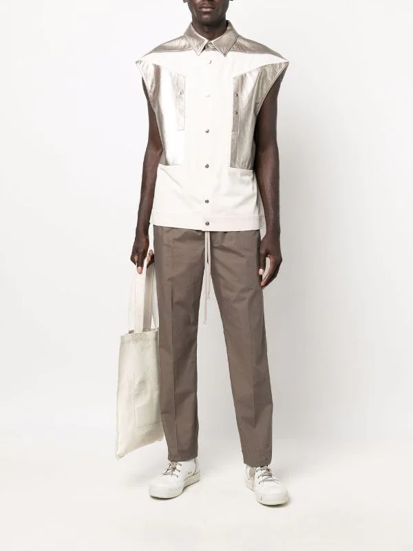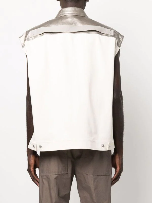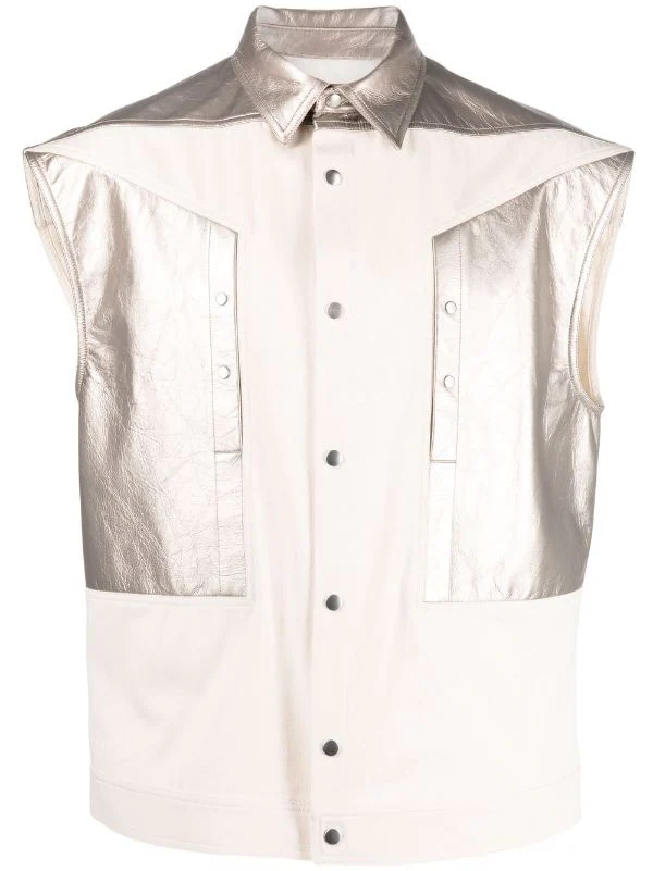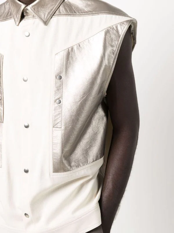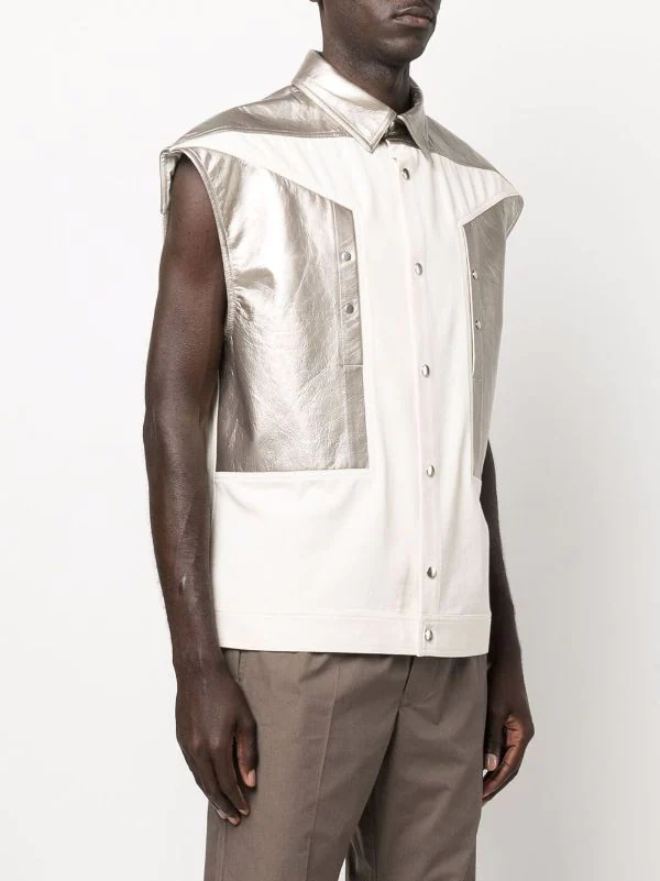 Modèle bicolore, col classique, boutonnière sur le devant, deux poches latérales boutonnées, design sans manches, ourlet droit.