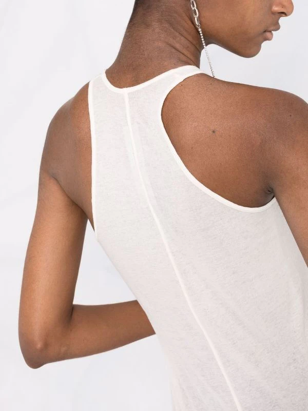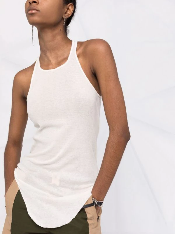 Encolure ronde, dos nageur, ourlet incurvé. Couleur : blanc. Matière : coton.
