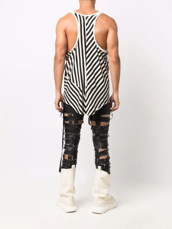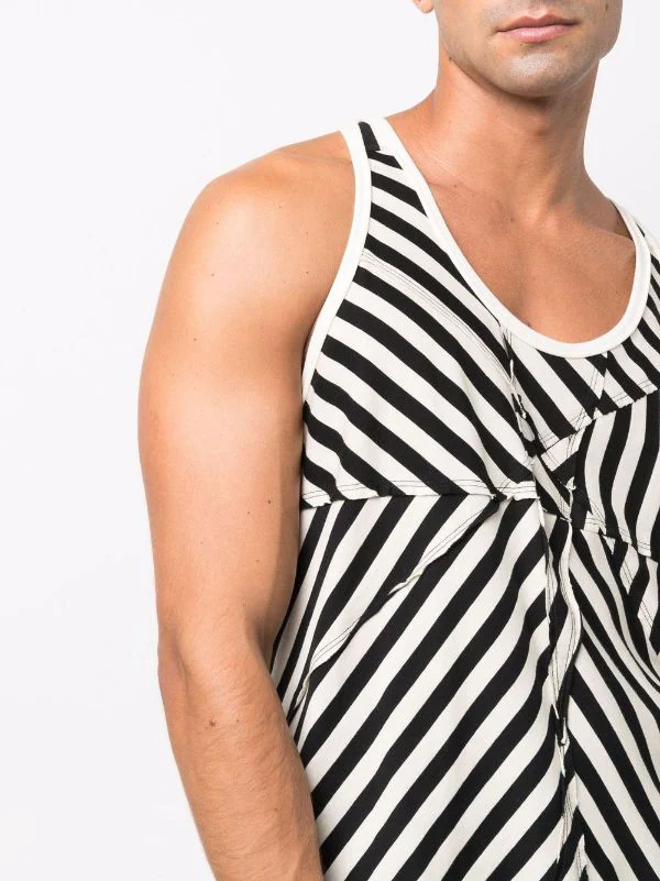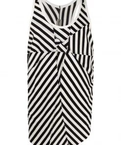 Modèle bicolore, imprimé à rayures, col arrondi, design sans manches. Matière : coton.